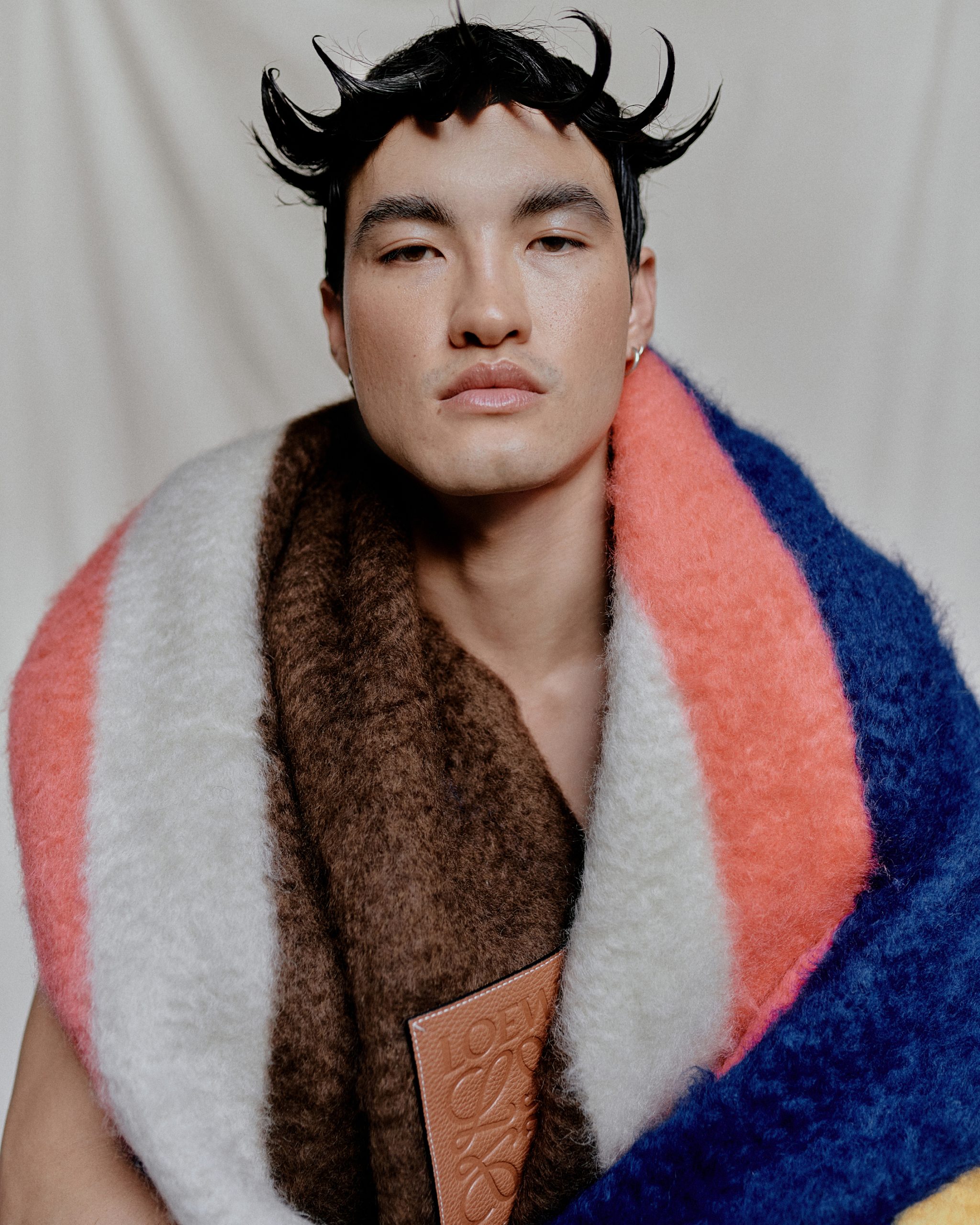 Left: Lukmon wears vest Wales Bonner at Mr. Porter. Right: Jonathan wears scarf Loewe at Mr. Porter.