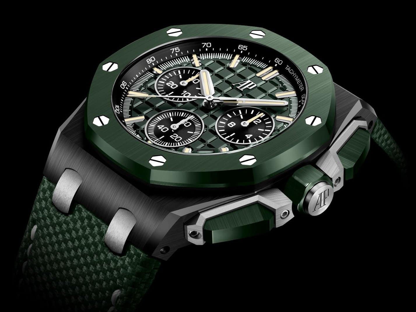 This timepiece features a 43 mm black ceramic case accented with a green ceramic bezel, crown, and push-pieces — a first at this size. Titanium elements add contrast, while the dial showcases a dark green PVD Méga Tapisserie pattern with black accents and silver-toned luminescent hands. A sapphire and titanium caseback reveals the Calibre 4401 movement inside. Finished with a dark green leather strap or a black rubber strap, it blends elegance with sportiness.