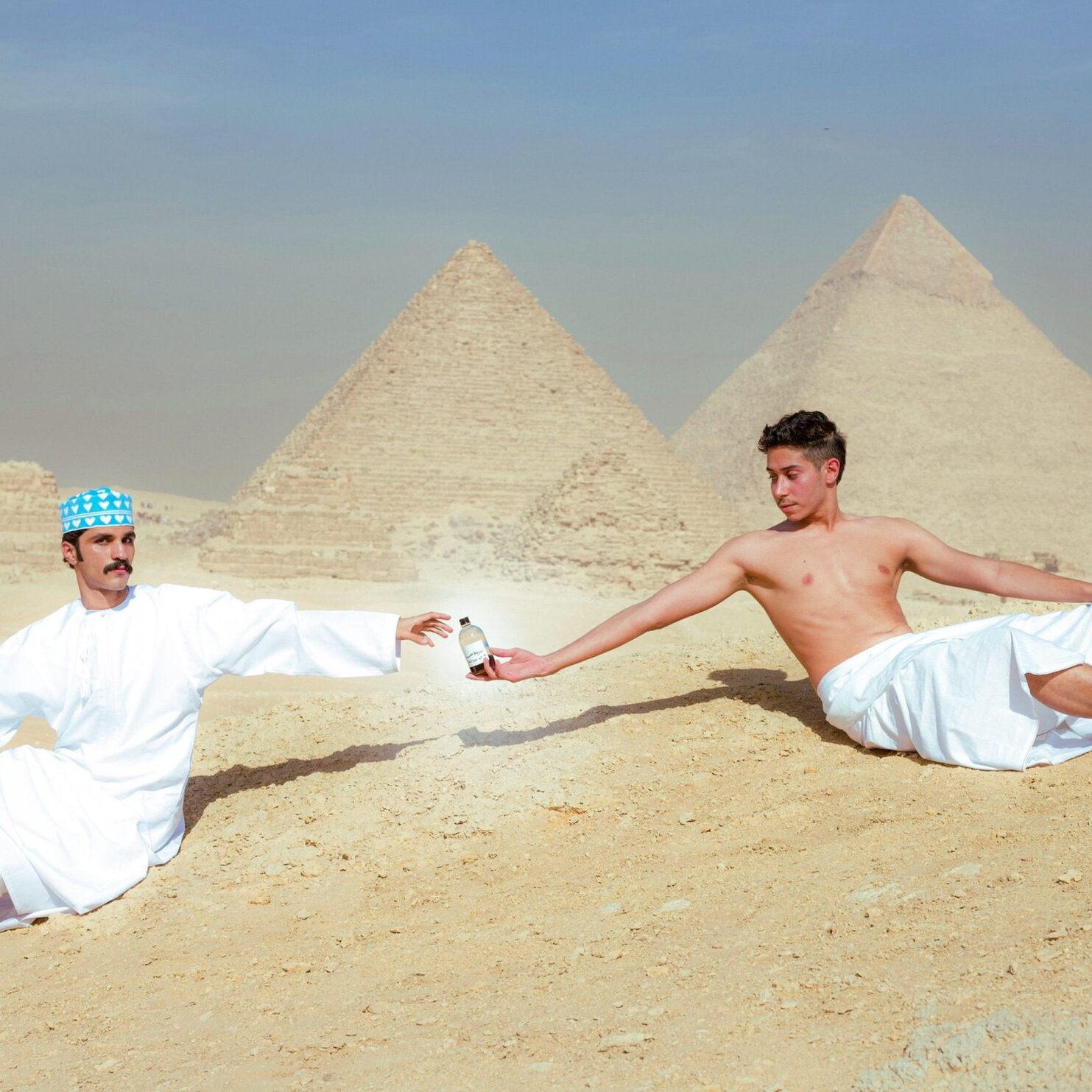 Portraying a soft masculinity, something that has for long time existed in the background in this part of the world, Al-Hosni uses moments he found inspirational and recreates them using Omani culture. In one of his powerful images, Abdulaziz, inspired by the painting The Creation of Adam, explores Omani youths love for the supernatural. Backdropped by the pyramids of Giza, “a young Omani man finds himself in ancient Egypt searching for an ever- potent love potion. The young man befriends a local Egyptian boy who has curated and harnessed the power of this potion.”