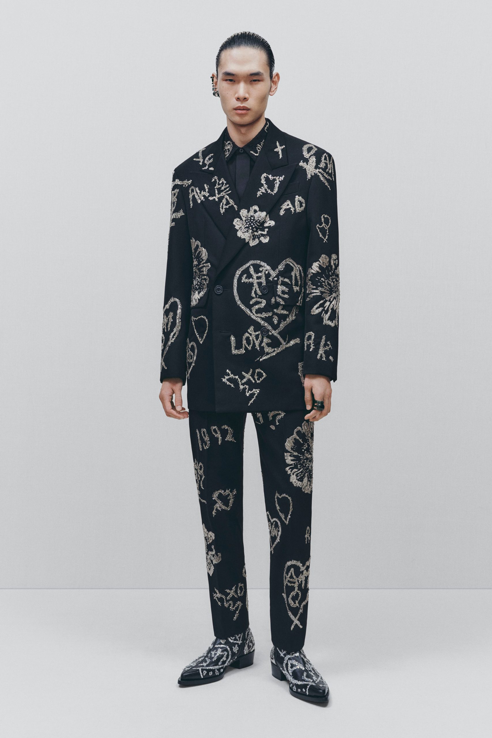 The Autumn/Winter 2022 Menswear collection is fitted with fair isle knits, similar to that used in the pre-fall collection. Beaded suiting and Cuban heeled boots featured initials and other scribbled fancies, as well as hearts produced in embroidered pin and crystal and featured on clothing items. The same embroidery is prevalent in the house’s pre-fall collection. Other key items from the collection include a one-shouldered dress that has been purposefully crumbled and worn over a t-shirt and pants.
