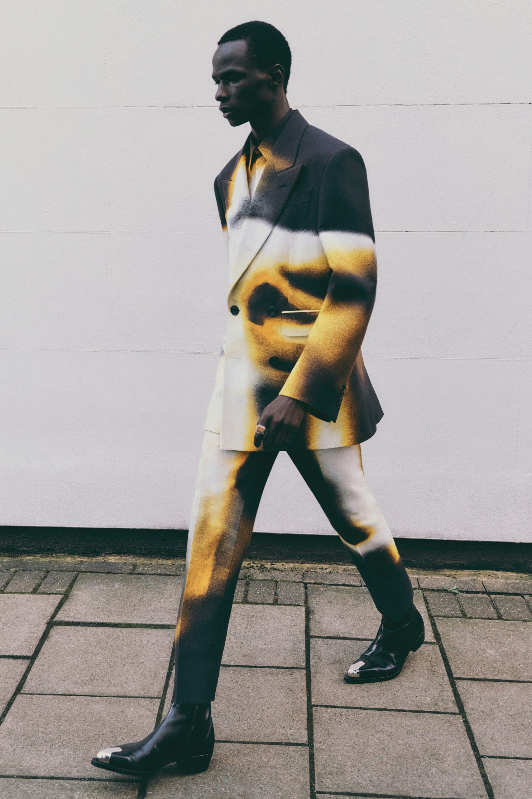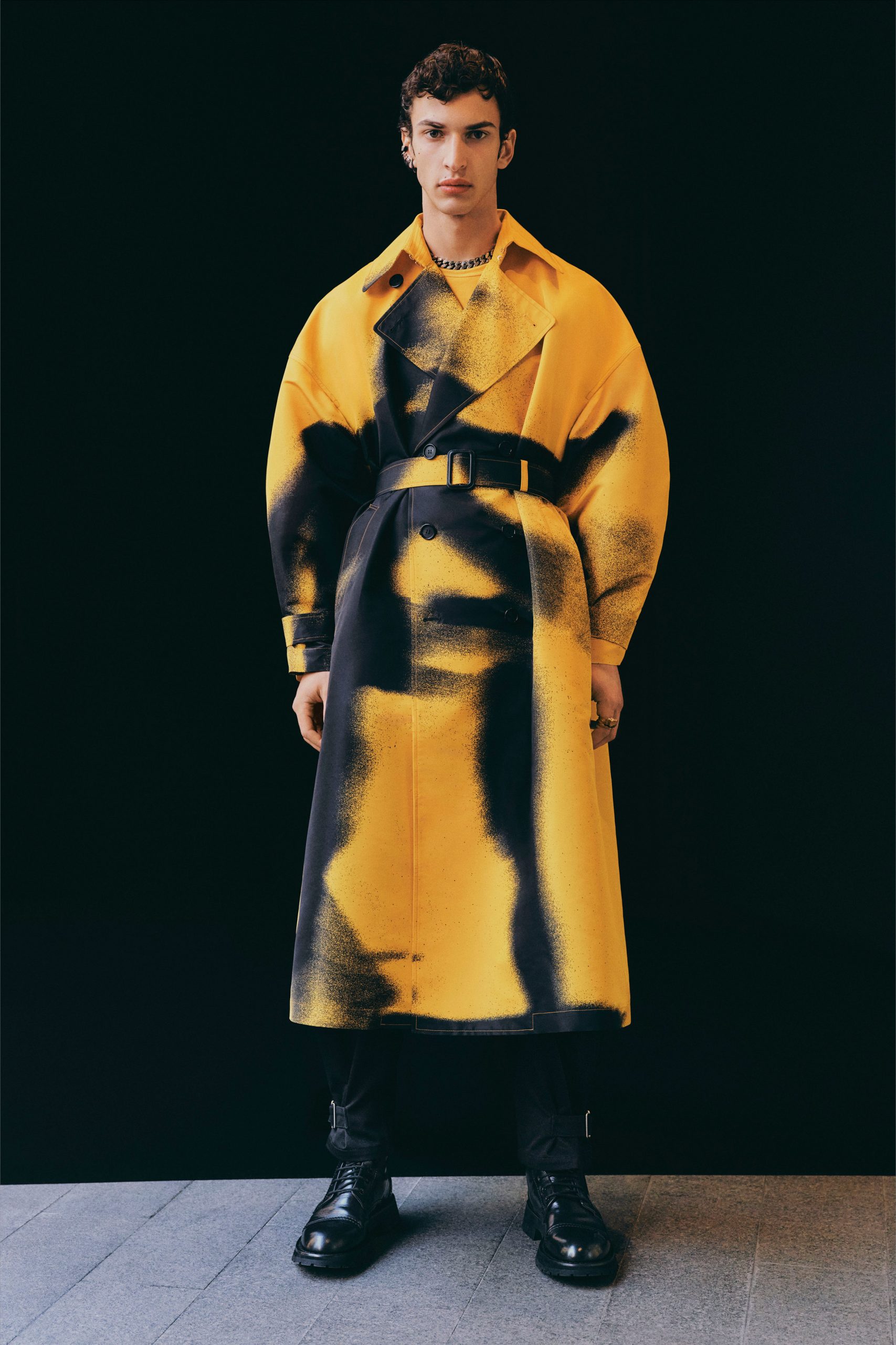 Pants were constructed to feature in-built jacket lapel skirts. Heatmap decoration in vibrant colours was blown up and used on suiting and outerwear. Other key pieces included graffiti jacquard and a trench crafted from the same crumple material from which the man-dress was created.