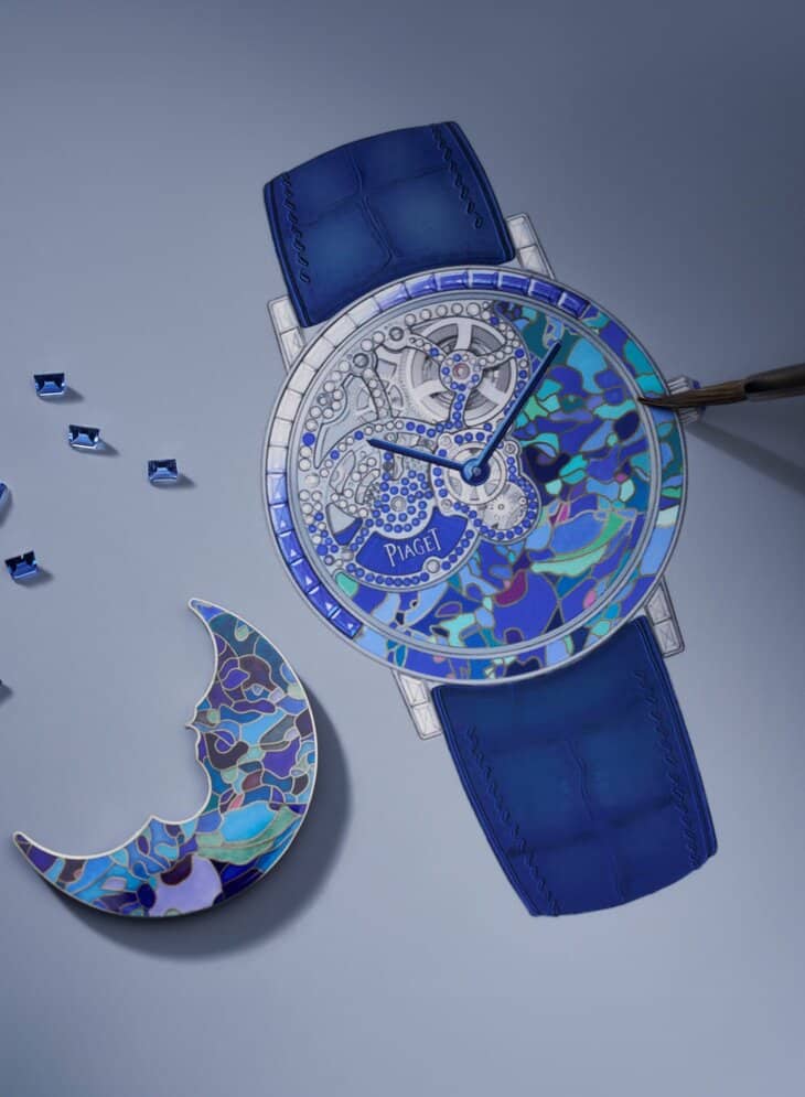 This new edition continues Piaget’s legacy of intertwining artistry and function. The 40mm masterpiece is encased in a frame just 7mm thick, a testament to the Maison’s talent for ultra-thin watchmaking. Adorned with baguette-cut diamonds and sapphires, the watch achieves perfect harmony between its architectural skeleton design and the vibrant hues of cloisonné enamel.For nearly two decades, Anita Porchet has brought her unparalleled enamelling expertise to Piaget’s creations.