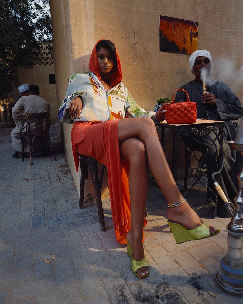 In one video Hammam sips coffee at a table in a bazaar as a local enjoys a shisha pipe. Her statement orange designer tote compliments the rich textures of the Bedouin landscape. In another, the model is literally dazzling in gem-dripping shoes atop of an Arabian carpet while a third video pays homage to the Arab horse.