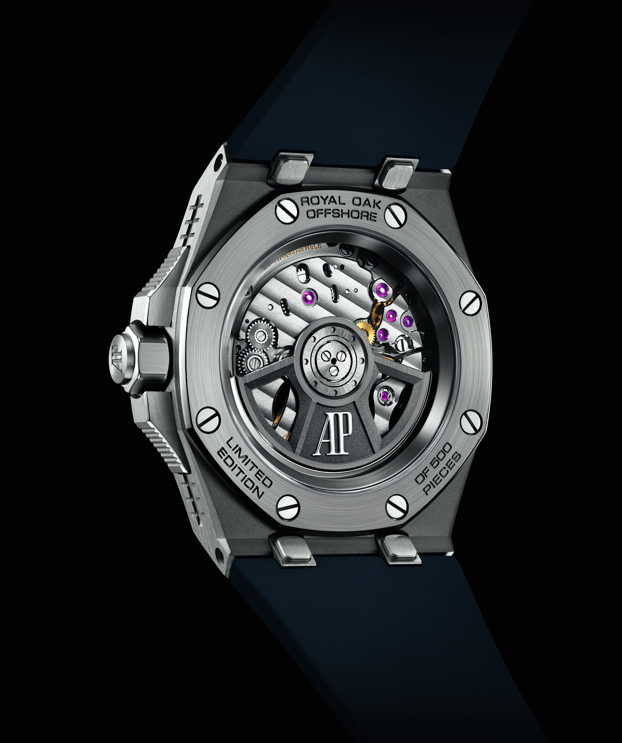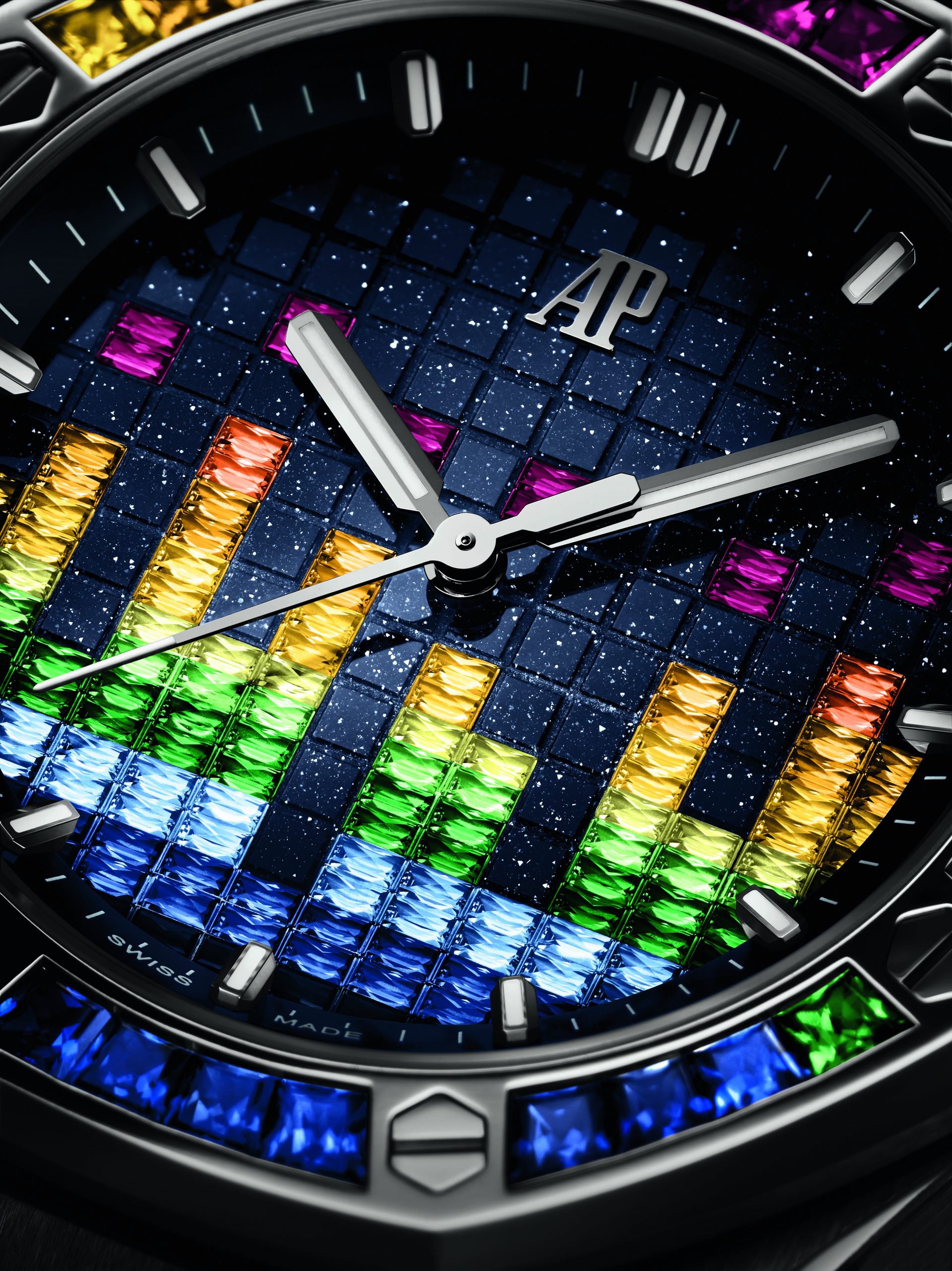 The titanium iteration features blue dials that serve as a background for the printed VU coloured meter that delivers a shimmering contrast. The dial also features the AP monogram in polished white gold at 12 o’clock and 18-carat white gold hour markers. The 37- and 43-mm versions feature interchangeable rubber straps in various colours.