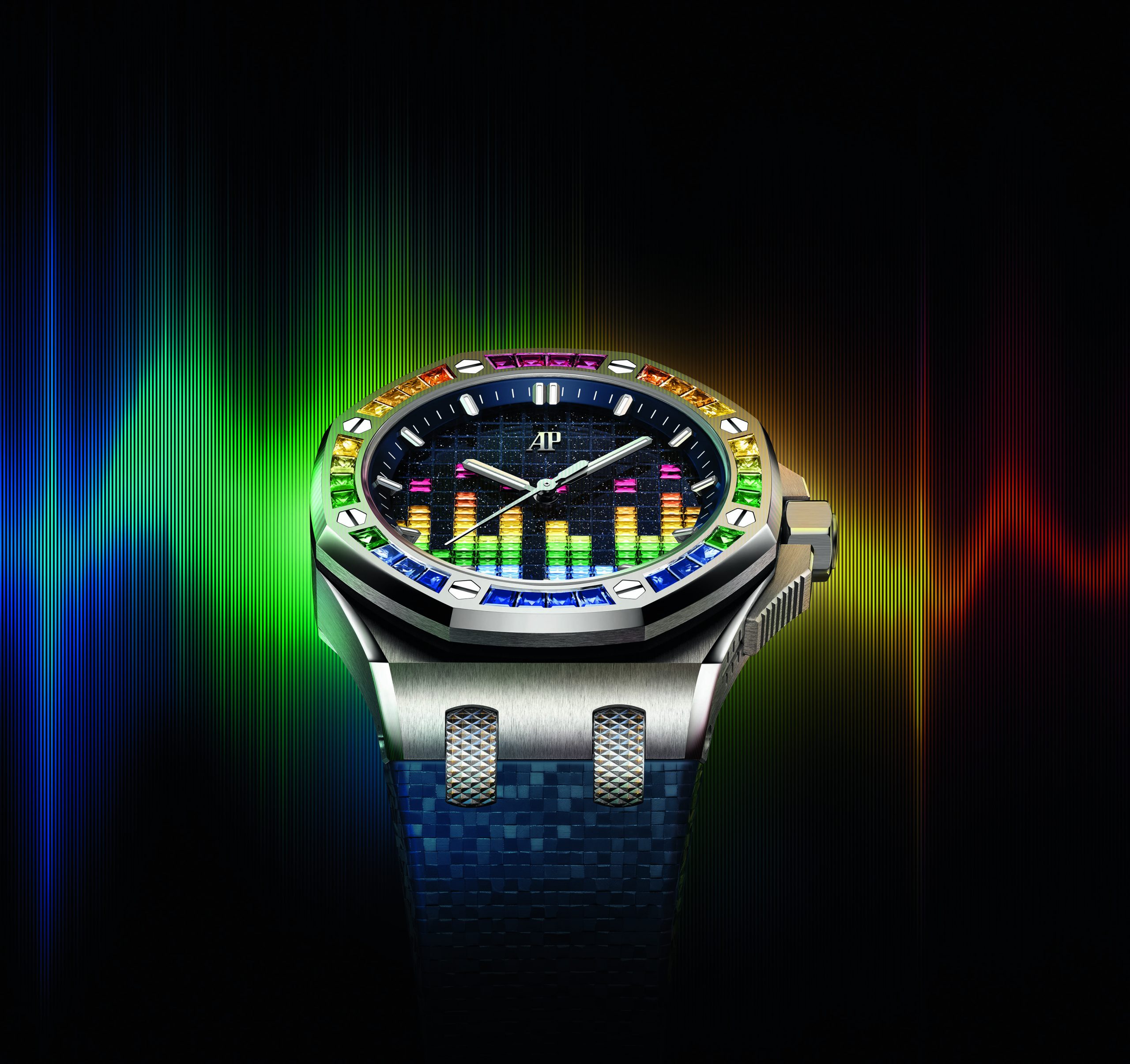 The Royal Oak Offshore collection celebrates the long-standing relationship with music. This version features a Tapisserie dial that references the motifs of an equalizer, knurled-textured studs reminiscent of jack plugs, and crown guards that draw inspiration from the fader on mixing consoles.