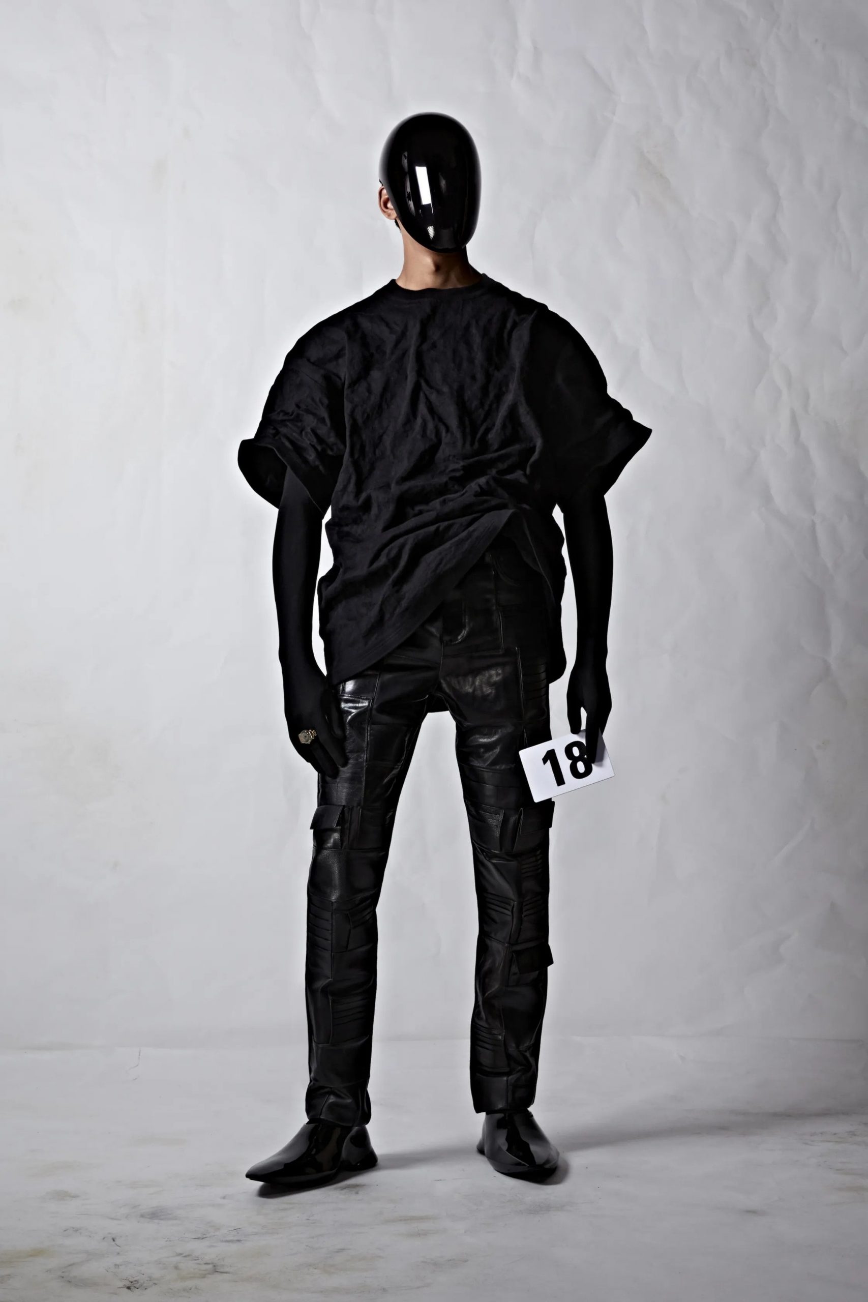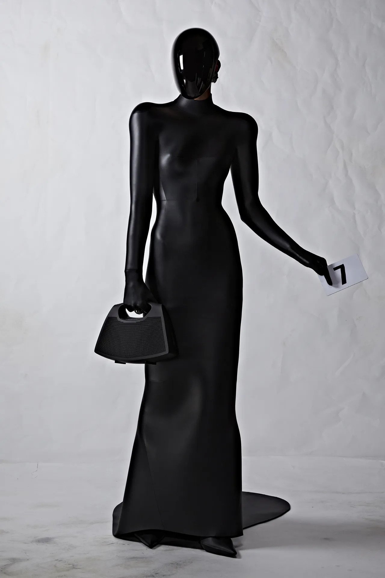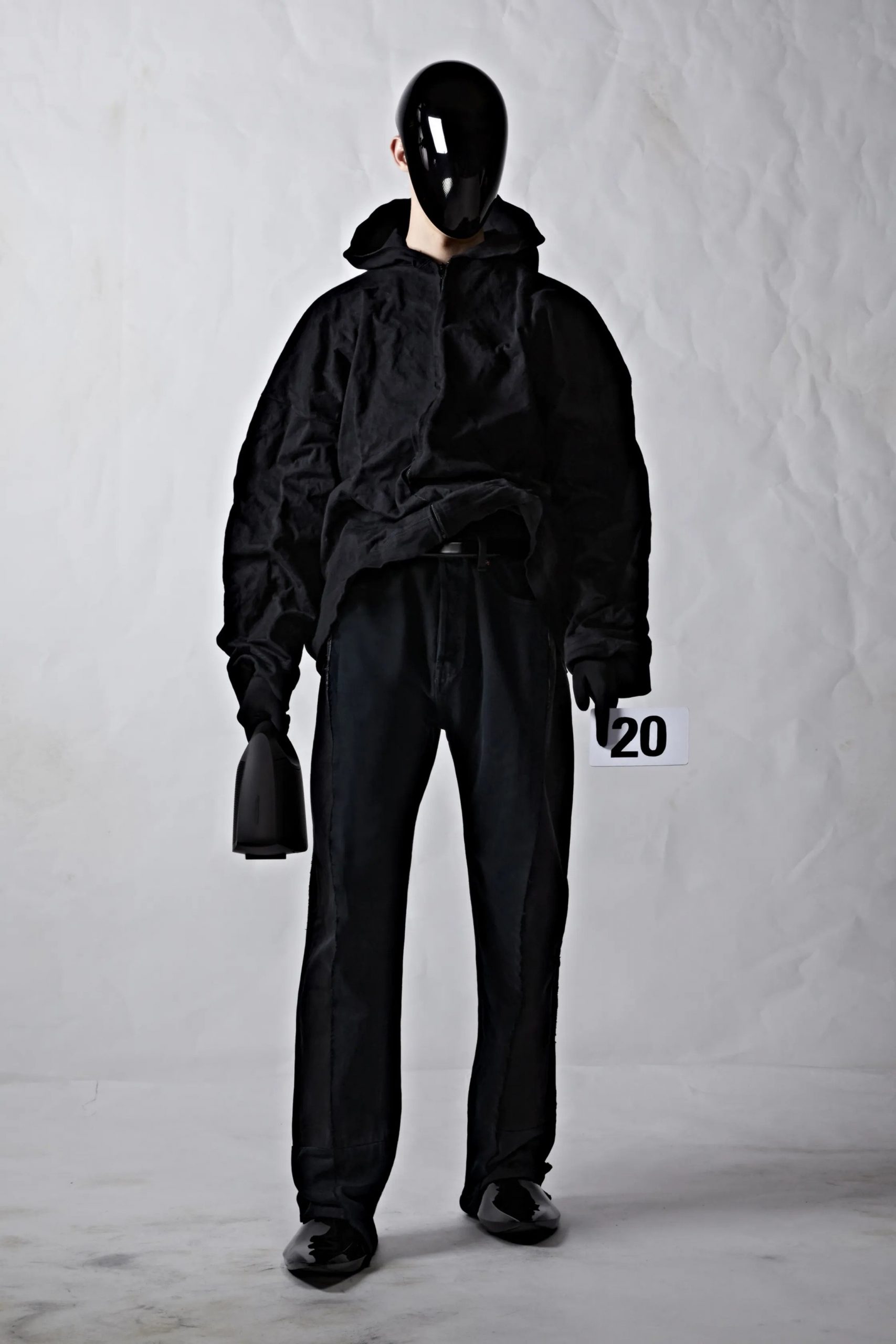 As AI voiced Demna’s love poem, models covered in black neoprene faces covered with hi-tech reflective masks descended the runway, walking purposefully with toolbox handbags in hand. It was dystopian, and it was intrinsically Demna’s Balenciaga.