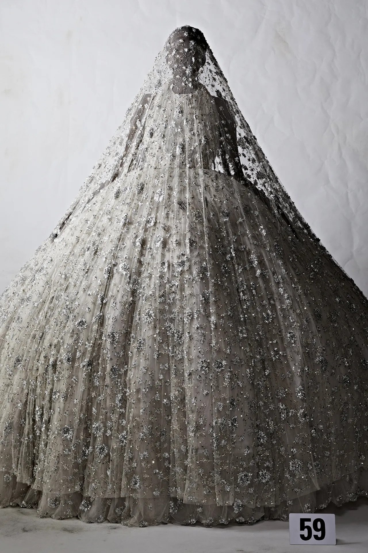 Gvasalia’s show reached its penultimate moment when finally, the Balenciaga bride appeared. A backless white wedding gown covered completely with a crystal-embellished veil referenced an archival motif. A piece of art, the wedding gown went through a 7,500-hour embroidery process that used 25 paillettes and beads and thousands of crystals, silver beads, and sequins.