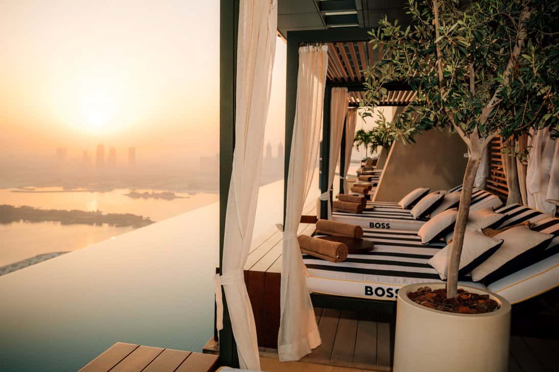 Sitting 210 metres above the ground, AURA offers spellbinding panoramic views of Dubai’s iconic skyline, the mesmerizing Palm Jumeirah, and the sparkling Arabian Gulf. This one-of-a-kind experience is an ode to the senses, an invitation to immerse yourself in the highest 360-degree infinity pool Dubai has to offer, as BOSS effortlessly blurs the lines between fashion and leisure.