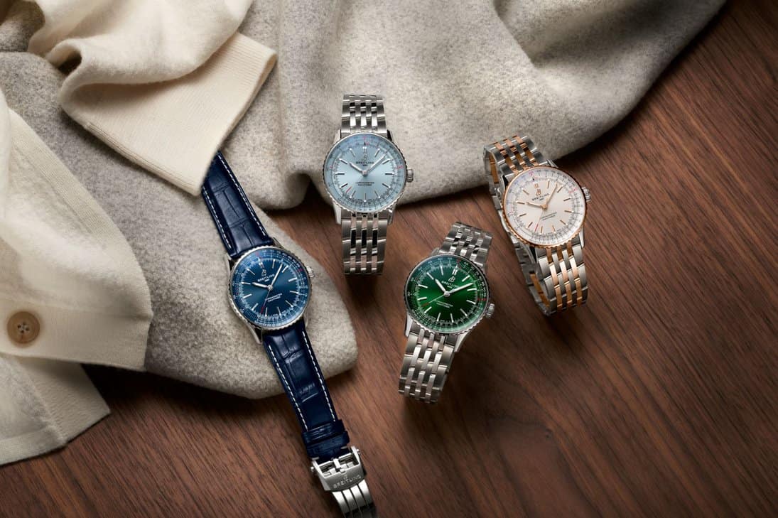 The Navitimer Automatic 41 offers a clean and elegant design, omitting the chronograph and instead focusing on a balanced, uncluttered dial. Available in stainless steel, two-tone, and full gold versions, the Automatic 41 is available with dials in black, blue, silver, ice blue, and green. The use of responsibly mined gold in the full gold versions aligns with Breitling’s commitment to sustainability, making these models not just a style statement, but also an ethical choice. Both models feature a notched bezel, alternating polished and brushed finishes, and options for alligator leather straps ensure comfort and versatility.