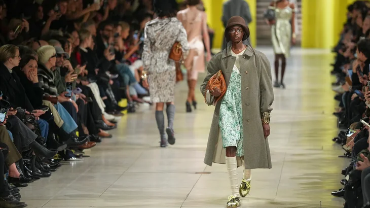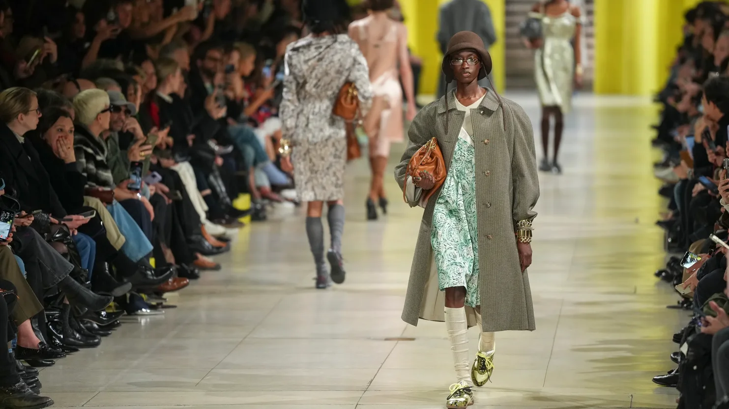 In the midst of a fashion month defined by restraint—economically, emotionally, aesthetically—Miuccia Prada chose distortion over discipline. Set against citron moiré walls and accompanied by off-kilter “elevator music,” her FW25 collection explored the absurdity of performance: of womanhood, of nostalgia, of dressing up when the world feels like it’s coming undone.