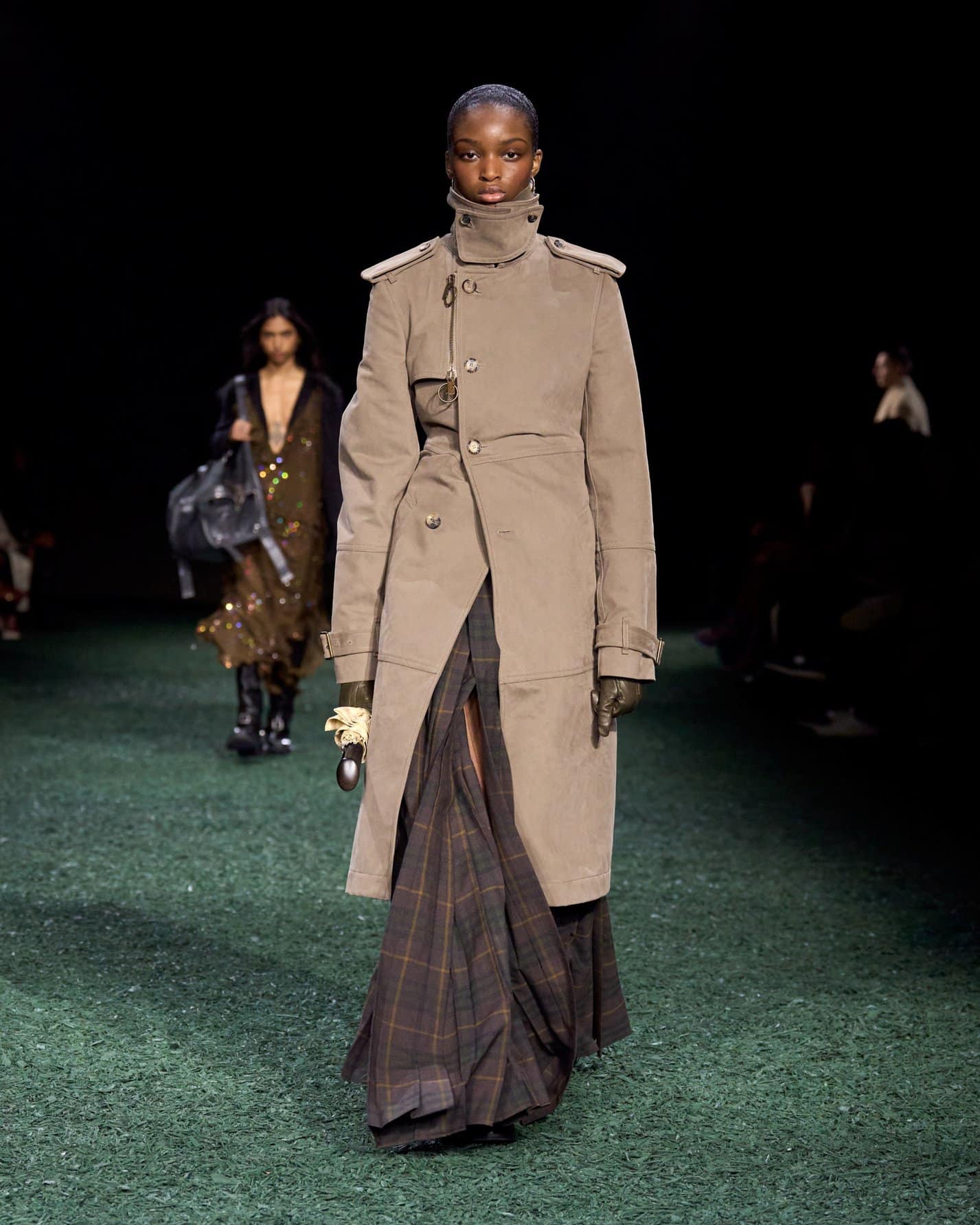 ‘There’s a sense of craft in this collection. We began in the Burberry archive and the mills of Lochcarron and Donegal. I wanted to take a traditional approach to the fabrics and how each piece is made. Craftsmanship has always been at the heart of design,’ said Lee. ‘The collection itself is inspired by British and Irish wool and fabric, centred around protection and warmth. Burberry trenches are designed with texture in mind. Coats are at the core, shoes and bags are functional. These pieces are made for the outdoors.’