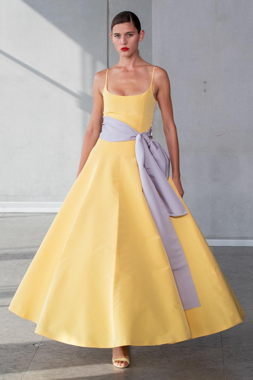 Carolina Herrera’s devotion to color shines through once again. This season’s palette showcases soft tones in dynamic combinations. A perfectly draped bias-cut dress in soft lilac silk gracefully caresses the body. Meanwhile, a matching button-up shirt and miniskirt ensemble in the same hue redefine everyday chic. Pieces in sunshine-yellow take center stage, from sharply tailored jackets paired with ethereal tulle skirts to spaghetti-strap gowns embodying the vision of American chic.