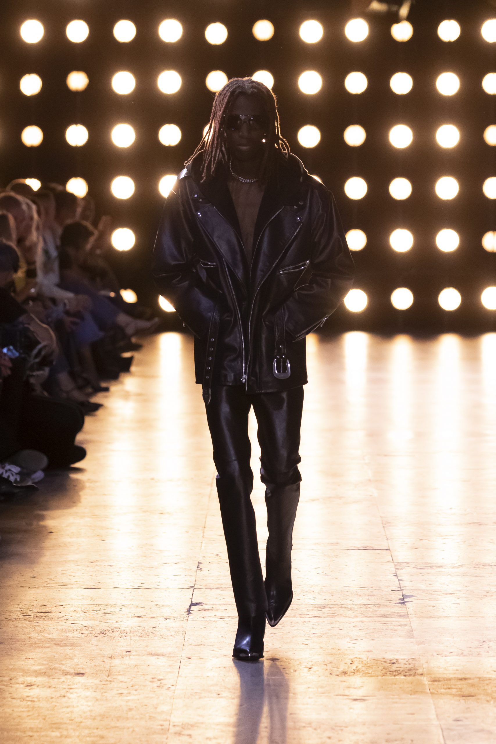 The show began amid much fanfare as celebrities worldwide seemed to have been in attendance. Setting the scene in pure Slimane fashion, as models in artfully jaded jeans, hems let down, and classic Slimane stovepipe leather pants emerged. Shoes came in pointed boots with cone-shaped heels, while blousons were decorated with studs, fringe, and all-over sequins.