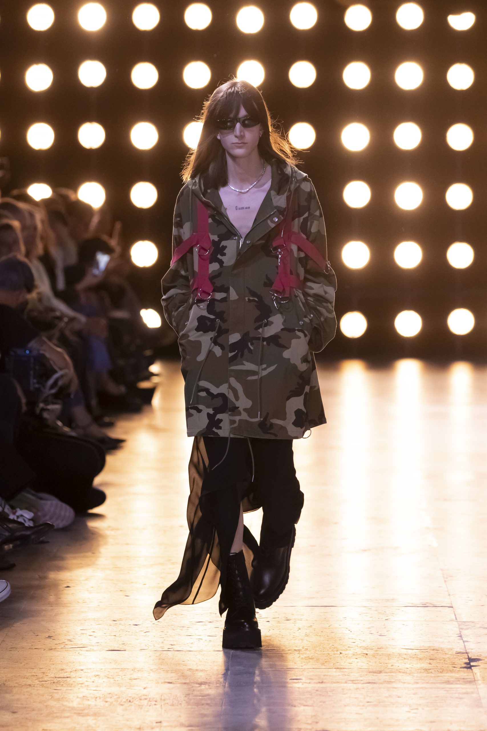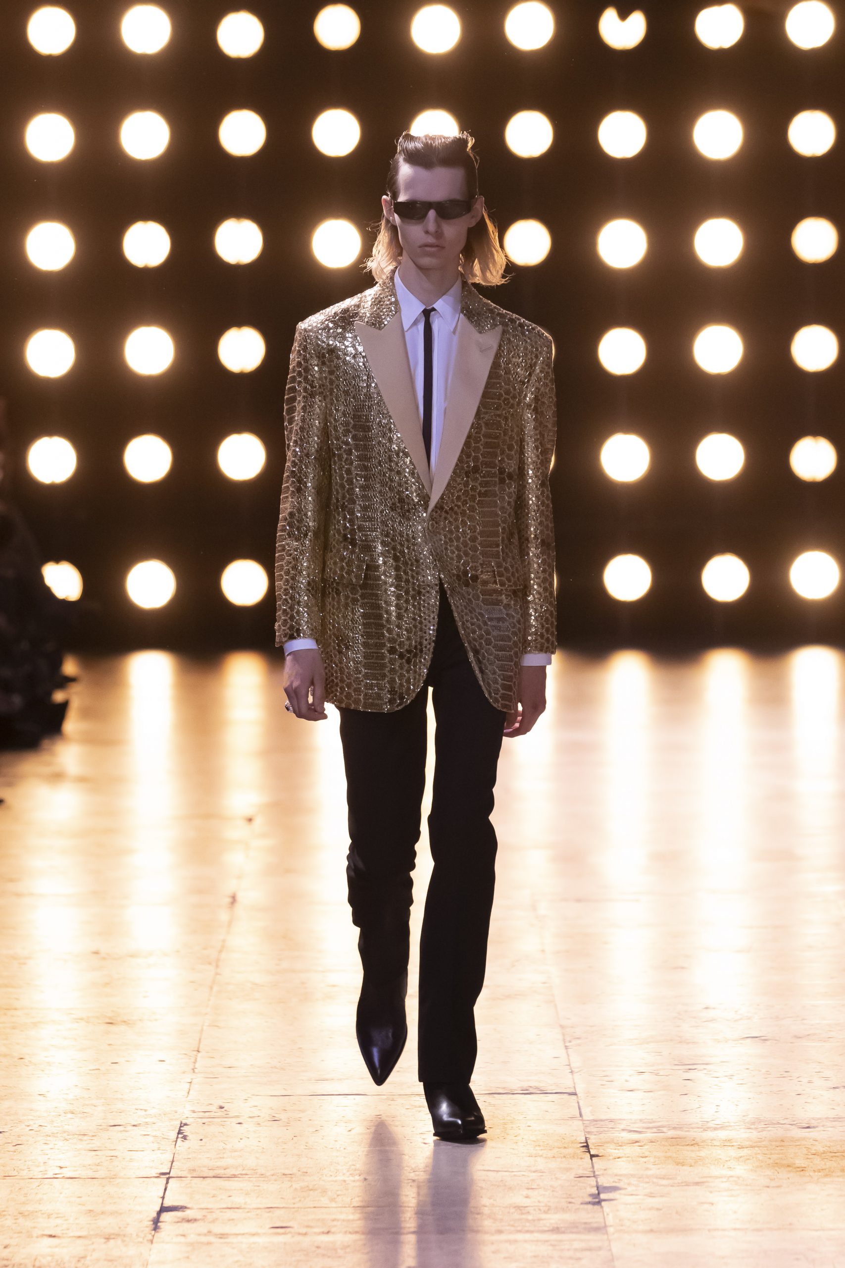 Heidi Slimane is known for his electric shows that coincide with the rock-star fashions he brought with him to Celine. What began in 1997 at Yves Saint Laurent and grew ever stronger by the time Slimane arrived at Dior Homme in the early oughts had only strengthened by the time he returned to Saint Laurent between 2012 and 2016. The collection for Spring 2023 was no different. Slimane is on a roll at Celine, and his collection is studded with hundreds of crystals.