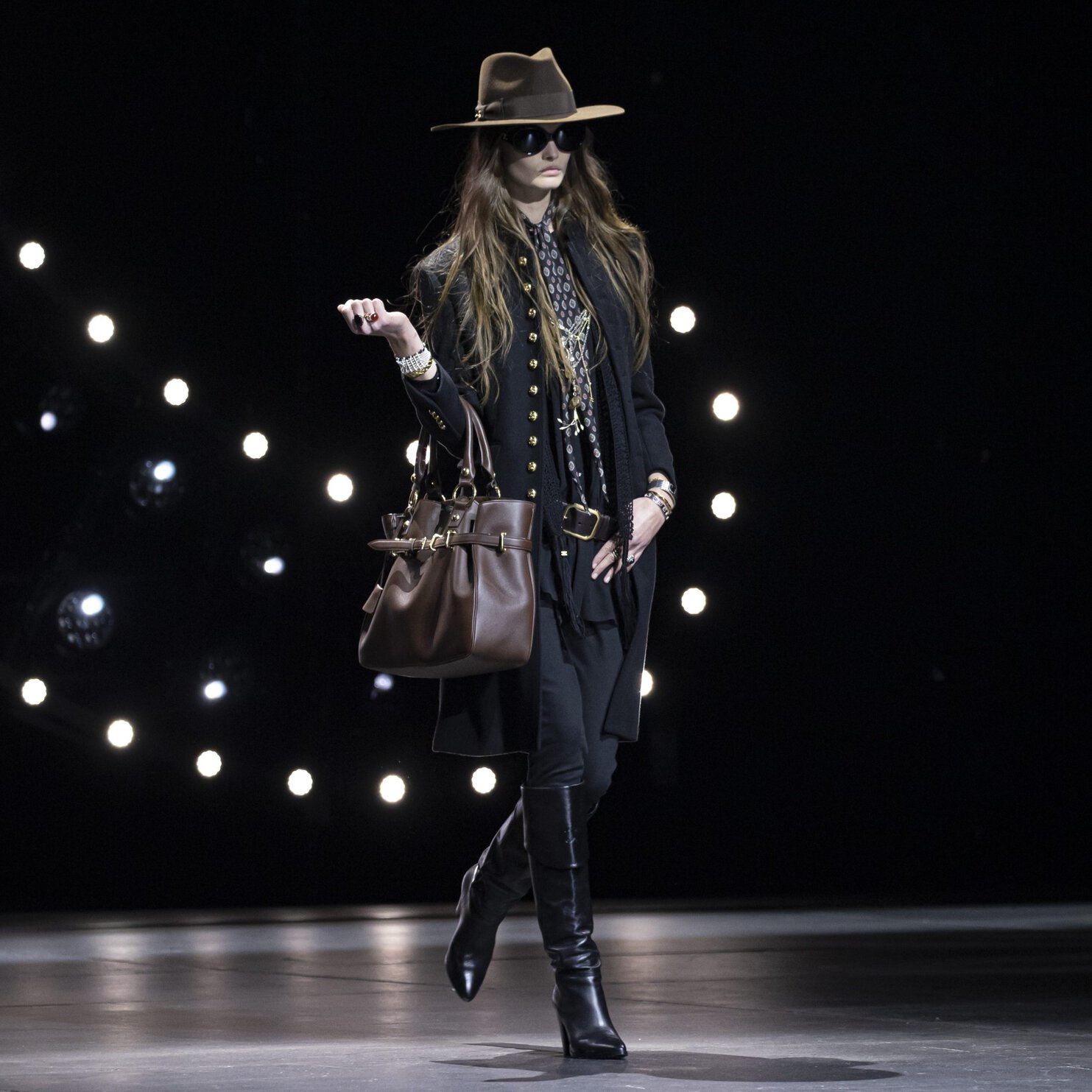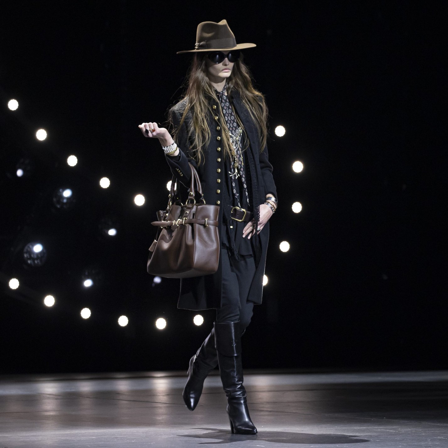 For this collection, the designer put tailoring at the fore. The show opened with a suit that presented undertones of indieness thanks to its gold buttons that ran from collar to hem, while fringed accessories and a bohemian slouchy leather bag, and riding boots brought together Sliman’s famous rock star chic. Elsewhere the collection featured faux fur jackets that dazzled with gold feathers. Jeans were classic Slimane – as skinny as they could possibly be, while leather boy jackets were paired with another Slimane trademark – tight leather pants. To put it plainly, the collection is filled with Slimane’s design DNA.