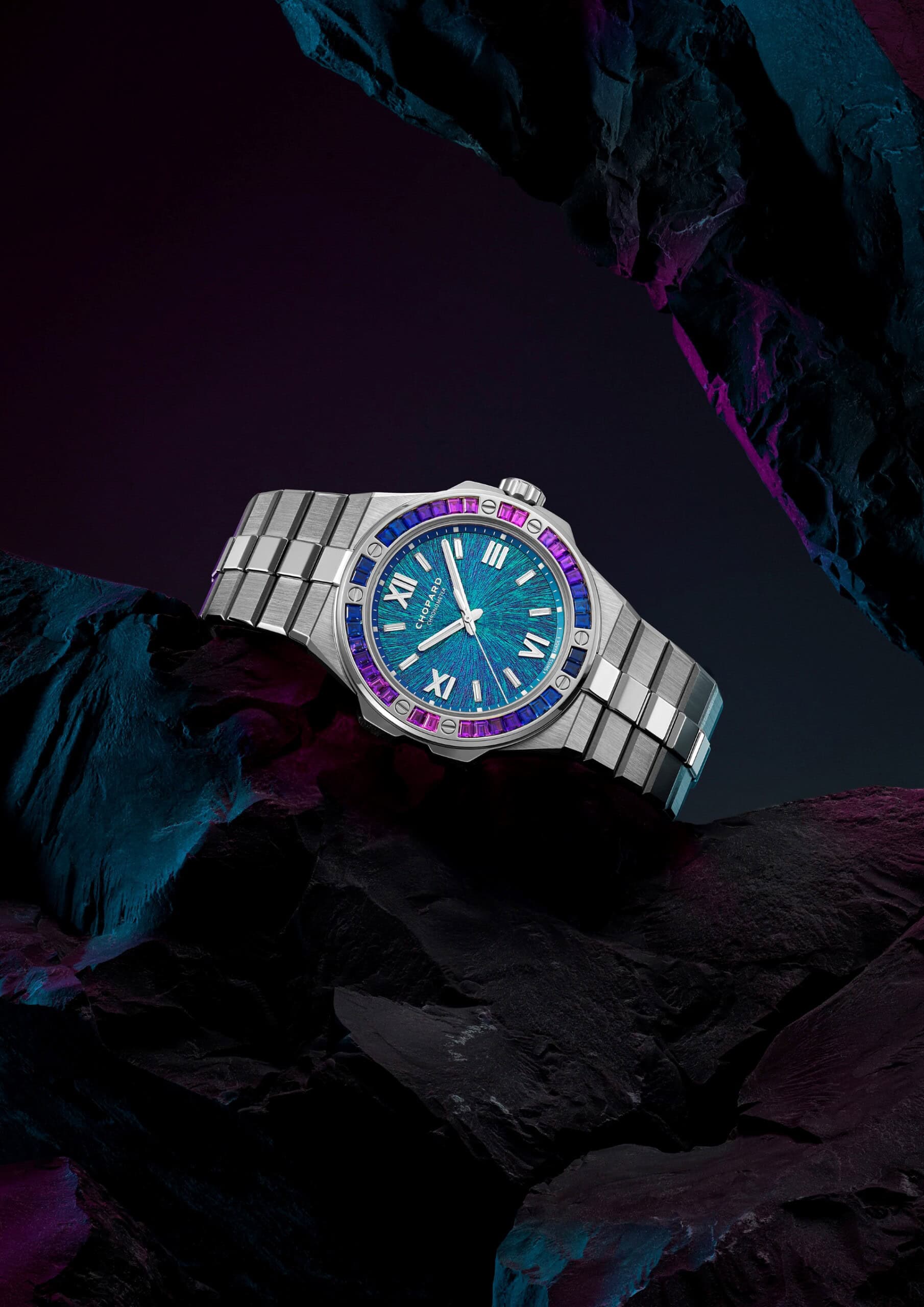 The Zinal Blue dial, inspired by the splendour of the Alpine landscape, takes centre stage in The Alpine Eagle Summit collection. Drawing its name from the Zinal Glacier in the heart of the Swiss Alps, this dial captures the shimmering reflections of blue and purple, creating a breathtaking spectacle. Featuring a radiating pattern reminiscent of an eagle’s iris, the textured dial showcases the purity of ice in blue hues and the translucent crystals of the glacier. This visual masterpiece is achieved through an innovative PVD treatment, creating unique variations between blue and purple, complemented by the eagle-eye structure which leads to gorgeous interplays of light and reflections.