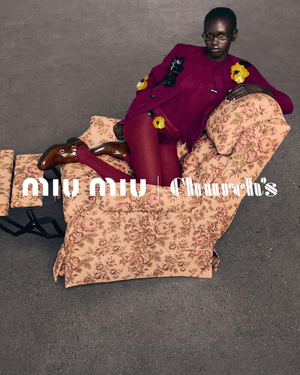 The partnership is brought to life through an arresting campaign. The backdrop of a gentleman’s armchair, draped in the opulence of archival Miu Miu fabric, sets the stage for a visual narrative that captures both refinement and innovation. The juxtaposition of classic furniture and contemporary fashion becomes a canvas for the models to express their individuality. In a dance of stillness and motion, they showcase the Miu Miu ready-to-wear collection alongside the Church’s X Miu Miu brogue and double monk strap shoes.