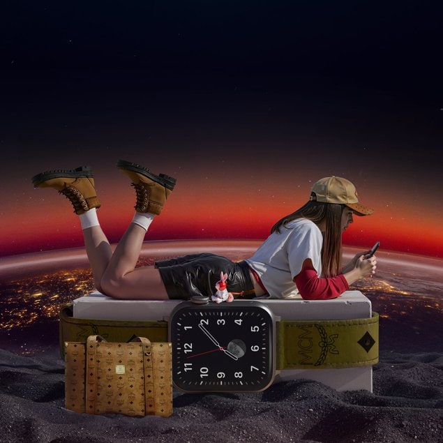 Elsewhere, we’re served a model nonchalantly seated on a UFO—yes, actually—wearing a zippered navy utility jumpsuit that’s giving flight-mechanic-discovers-fashion vibes. She’s holding a honey-coloured structured tote with MCM’s signature Visetos treatment, rivets intact. The bag’s construction is almost brutalist: boxy but elegant, with a slight architectural stiffness that nods to engineered design. The casting, the props, the chromatic tension, the giant-sized backpacks—this campaign passes styling, and goes onto full-on world-building for the brand.