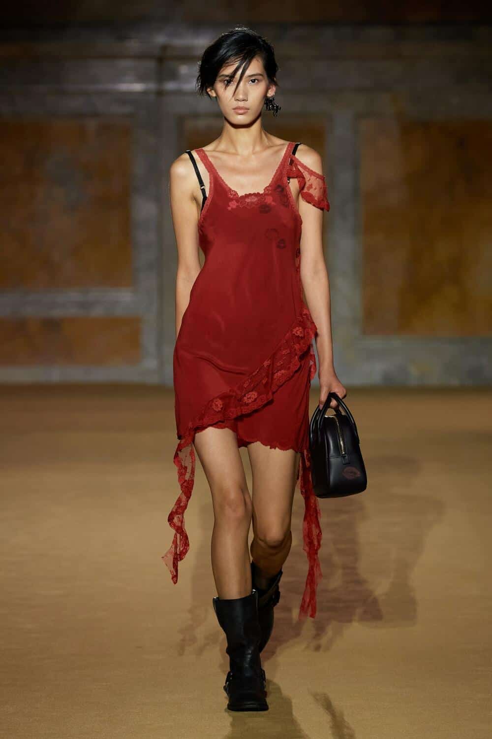 Spring 2024 also introduced and expanded on design concepts under Coach’s (Re)Loved program. This initiative is all about exploring circular craft, with a focus on reducing waste during the creative process. The collection featured repurposed leatherware and denim crafted from deadstock and pre-loved pieces sourced by Coach’s design team. Slip dresses were created with lace and fabric remnants from previous Coach productions. The brand’s commitment to sustainability continued with the use of regenerative and recycled materials, along with botanical dyes in slip dresses derived from marigolds, black walnut, logwood, indigo, and more.