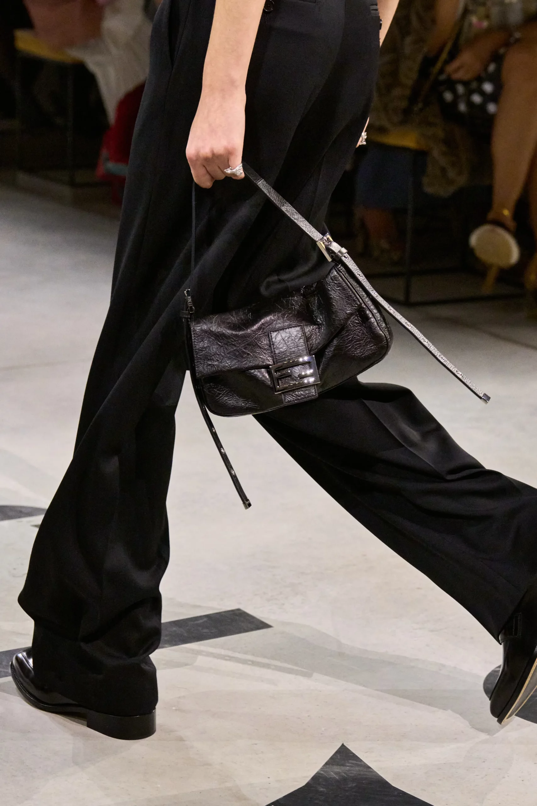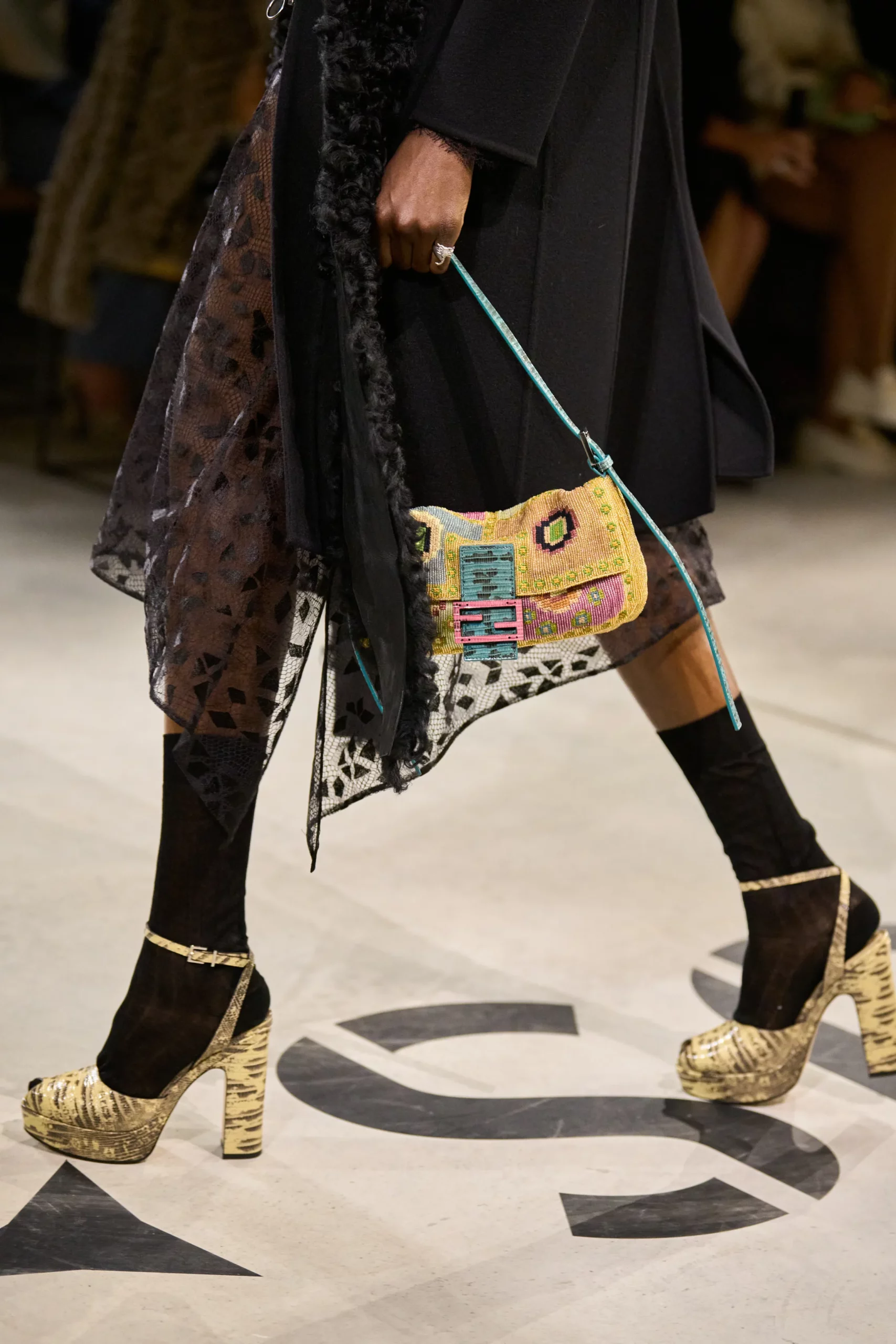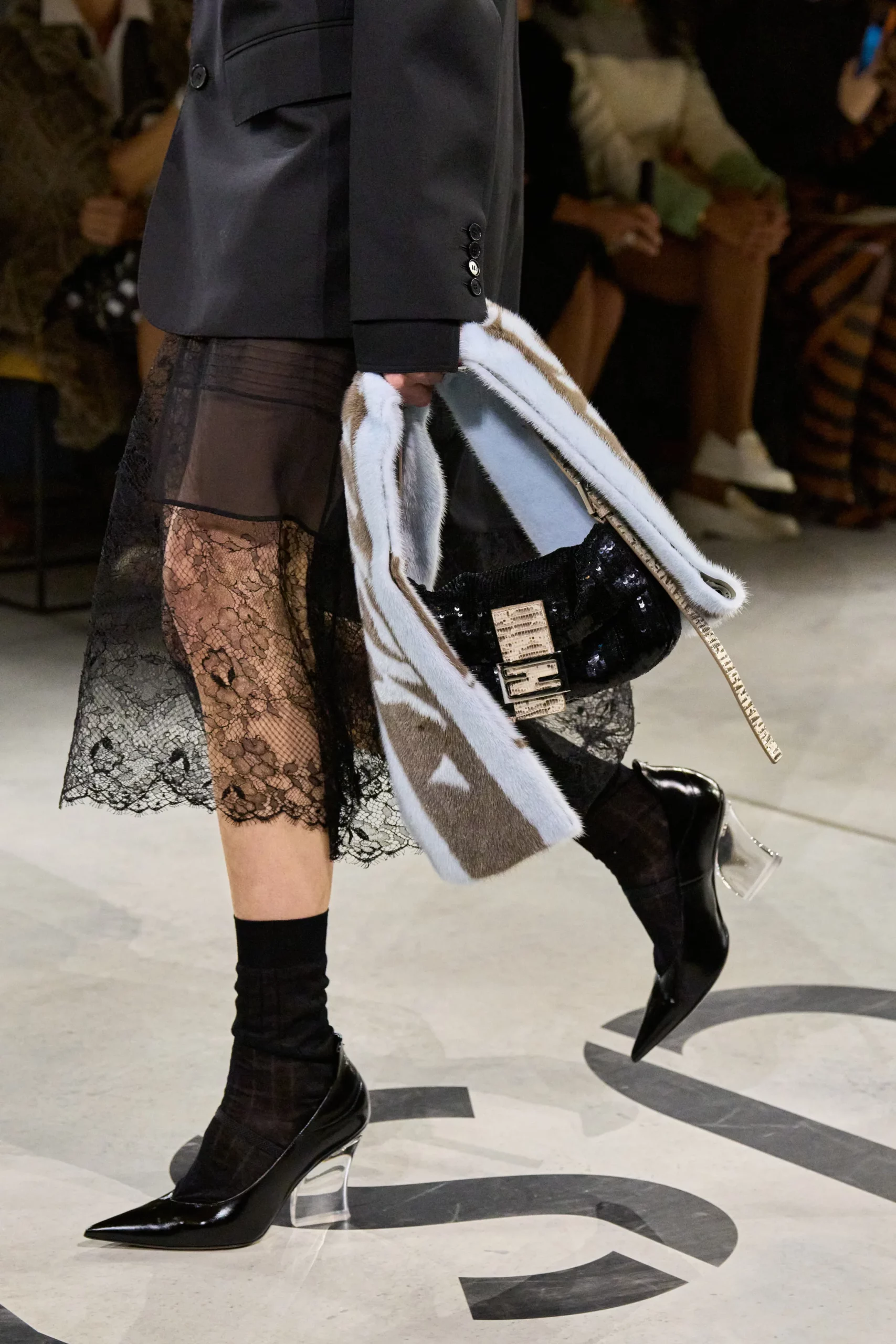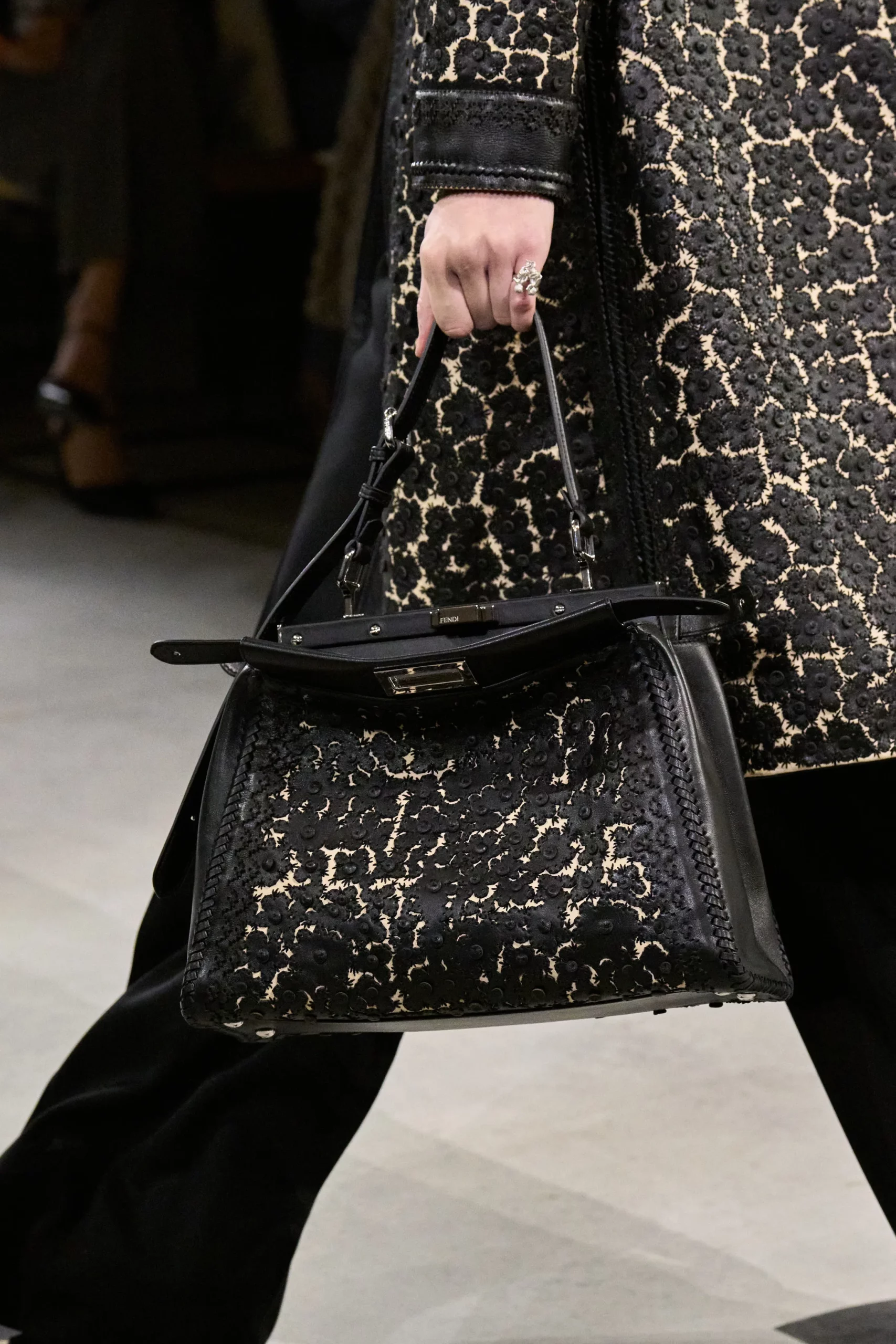 The Baguette returned, but not as a nostalgic prop. Reworked in bright animal prints, contrasted with leather, it cut through the neutrals like punctuation, a reminder that Fendi still understands desire. Still understands the cultural afterlife of a handbag. The Peekaboo surfaced quietly, moody in cheetah spots, matching coats in a way that felt less “set” and more instinctual.