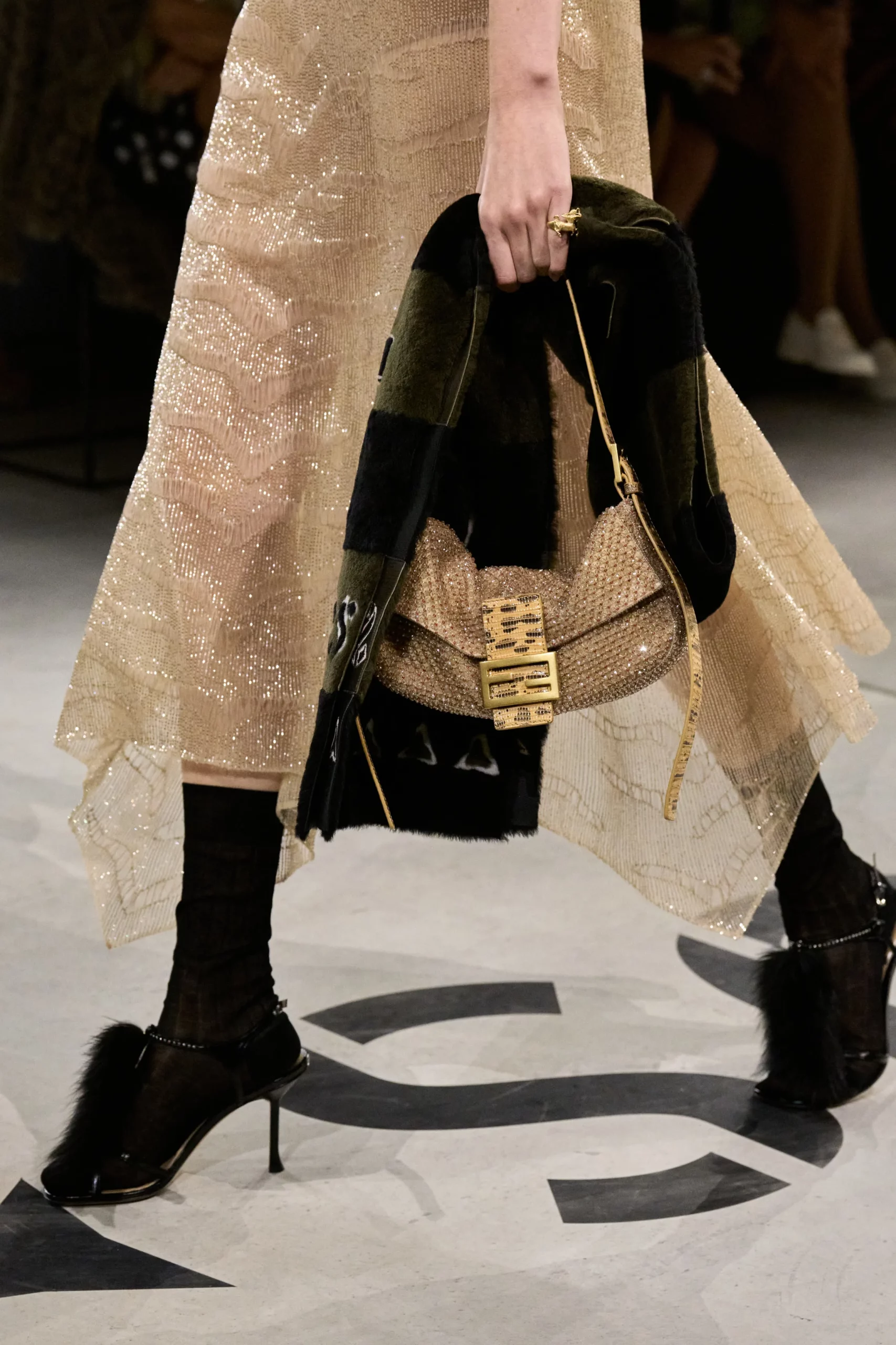 Then came cherry red, deliberate in a slip dress, and a furry stole draped over a bag. Against champagne sequins and neutral furs, the red felt like oxygen entering a room that had been holding its breath. And the furs — always controversial, always central to Fendi’s legacy — appeared texturally. Pops of fur rather than full-bodied opulence.