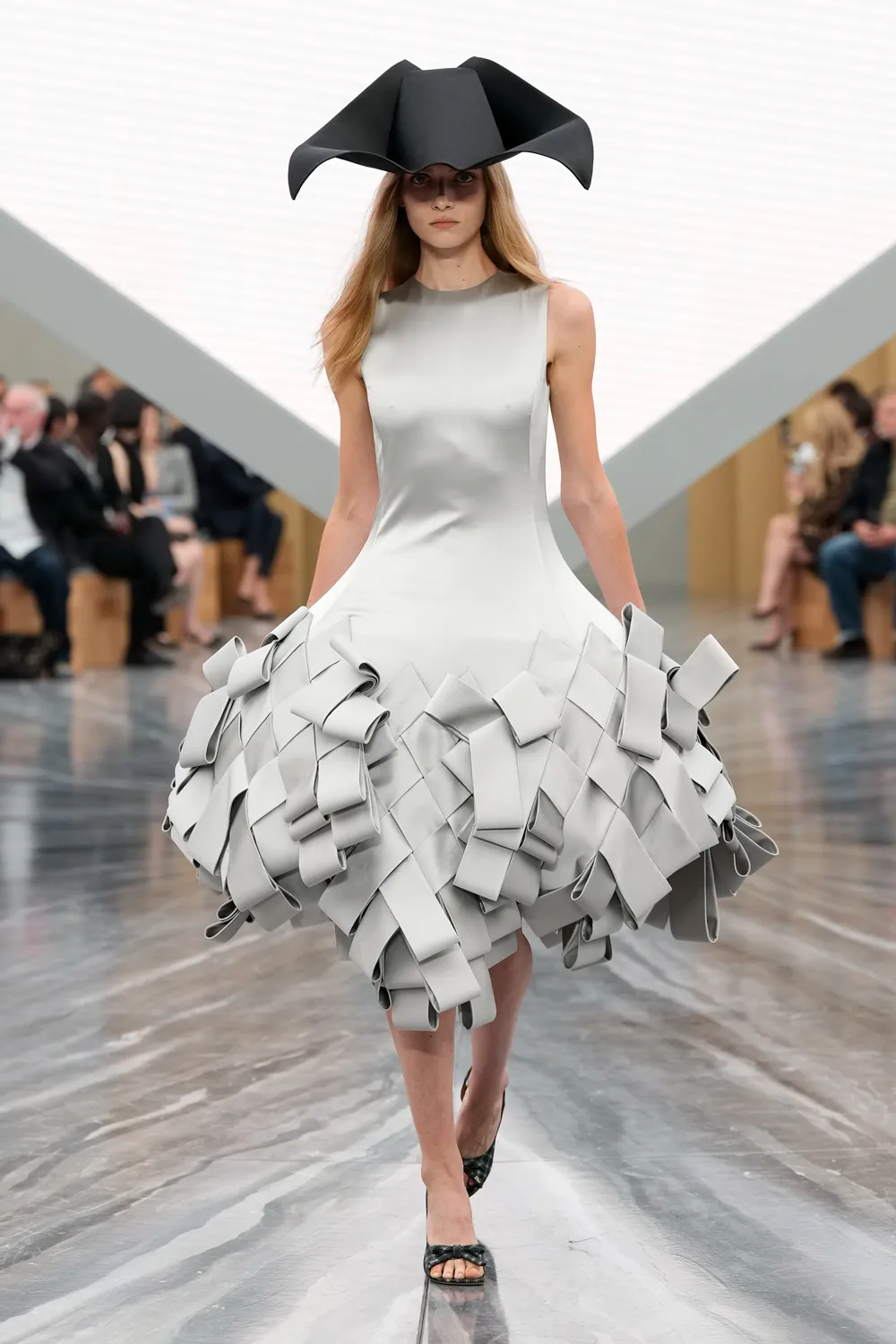 Anderson’s sculptural mastery was on full display. Fabric was twisted, layered, inflated, and folded into new volumes, a kind of living architecture. The inflated hips, the genius shrunken co-ords, the diagonal symmetry of bows, the balloon hems that no one saw coming, all revealed a hand confident in reshaping heritage.