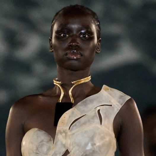 The bustier, which was styled with a brass snake bangle – also featured a postiche, emphasising the contrast of old and new. Merging these elements depict a rebuild of ancient masterpieces into a wonderful relic that pays homage to the inspiration of Rousteing’s SS/23 collection. The bag also references Egyptian alabaster tone and its unique translucent qualities which had become iconic through ancient Egyptian vases and artworks.
