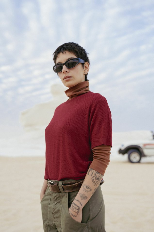 Rather than simply dropping in for a quick shoot, Kotn and its team spent multiple days camping in the desert. “We set up a base camp and visited all of these different locations that we grew up going to, with everyone in the clothing. There were 26 of us—a mix of cast members, a film crew, our local guides from Farafra, and my friends. We shared meals in the desert, ate Mendi cooked underground, drank Bedouin tea, and truly lived the experience.”