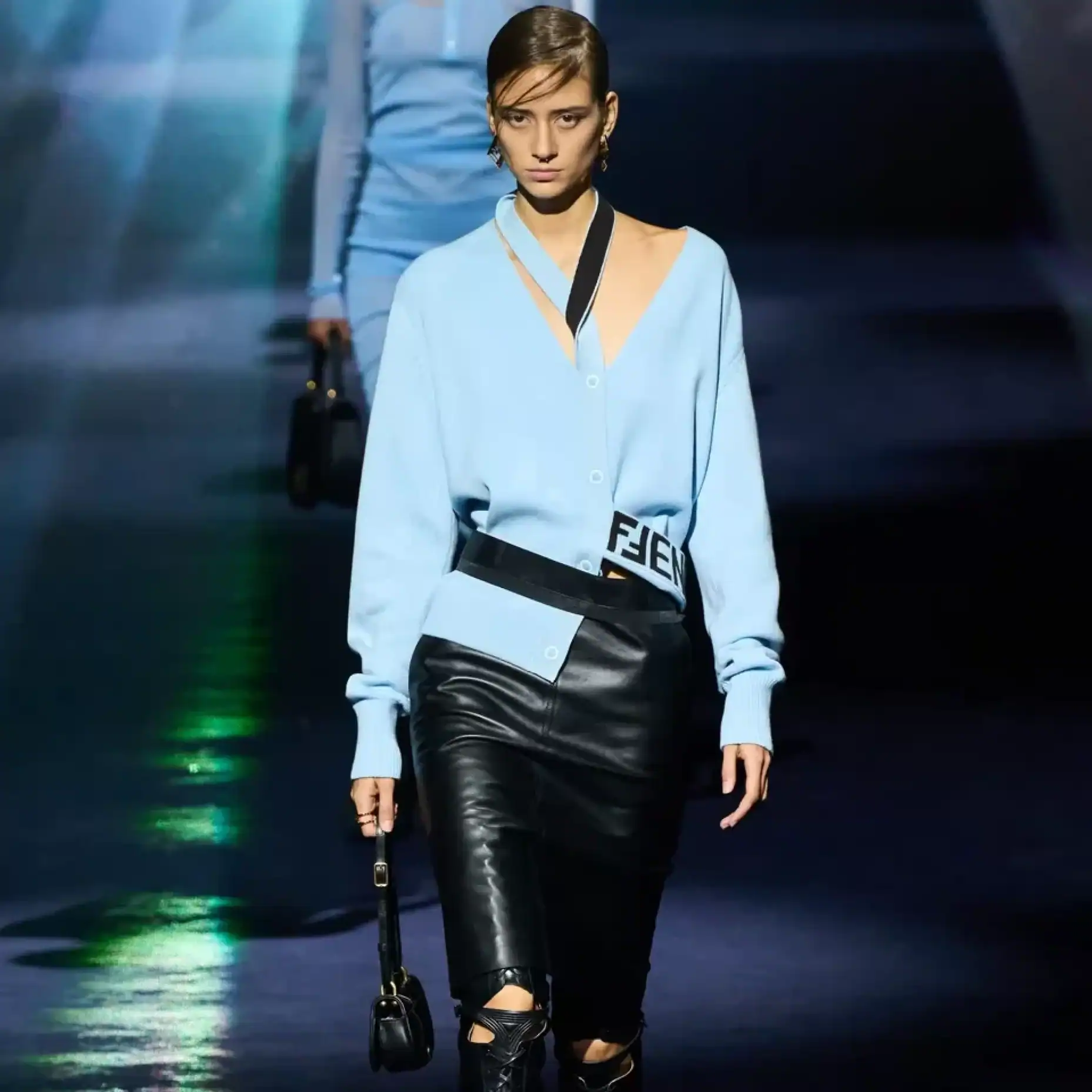 The collection is inspired by jeweller and designer Delfina Delettrez Fendi, and how she puts together her wardrobe and is so often wearing Fendi. The pieces play with binaries – the exploration and elevation of deconstruction, the interpolation of gendered archetypes, and the disturbance of ladylike sophistication.