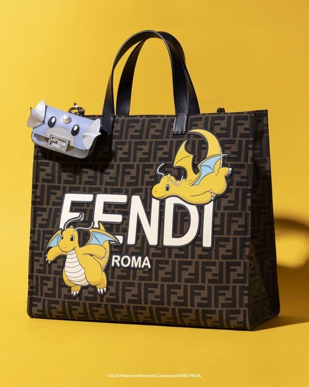 FENDI’s iconic Peekaboo and Baguette bags meet Pokémon to celebrate the Year of the Dragon. Leather goods expertly take on Pokémon through various stages, featuring inlays and prints on FF jacquard and FF canvas backings. The collection includes Dragonite and Dratini 3D marquetry in playful new Baguette and Mini Baguette bags. The Maison’s mastery extends to intricate micro beads FF embroidery on a special Baguette, featuring the three Pokémon with fringes. The collaboration includes Dragonite as a rare collector’s item, meticulously crafted by FENDI leather artisans.