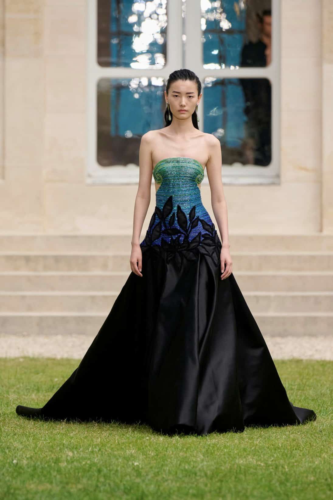 Rich, luxurious fabrics such as silk velvet, duchesse satin, mousseline, and tweed are central to the collection, expressing a spectrum of shades that reflect the vibrant tones of a twilight garden. The color palette ranges from soft mint greens to daring combinations of pinks, reds, and oranges, enhancing the collection’s visual impact. Accessories, including long gloves and sparkling earrings, add further layers of tonal focus and elegance.