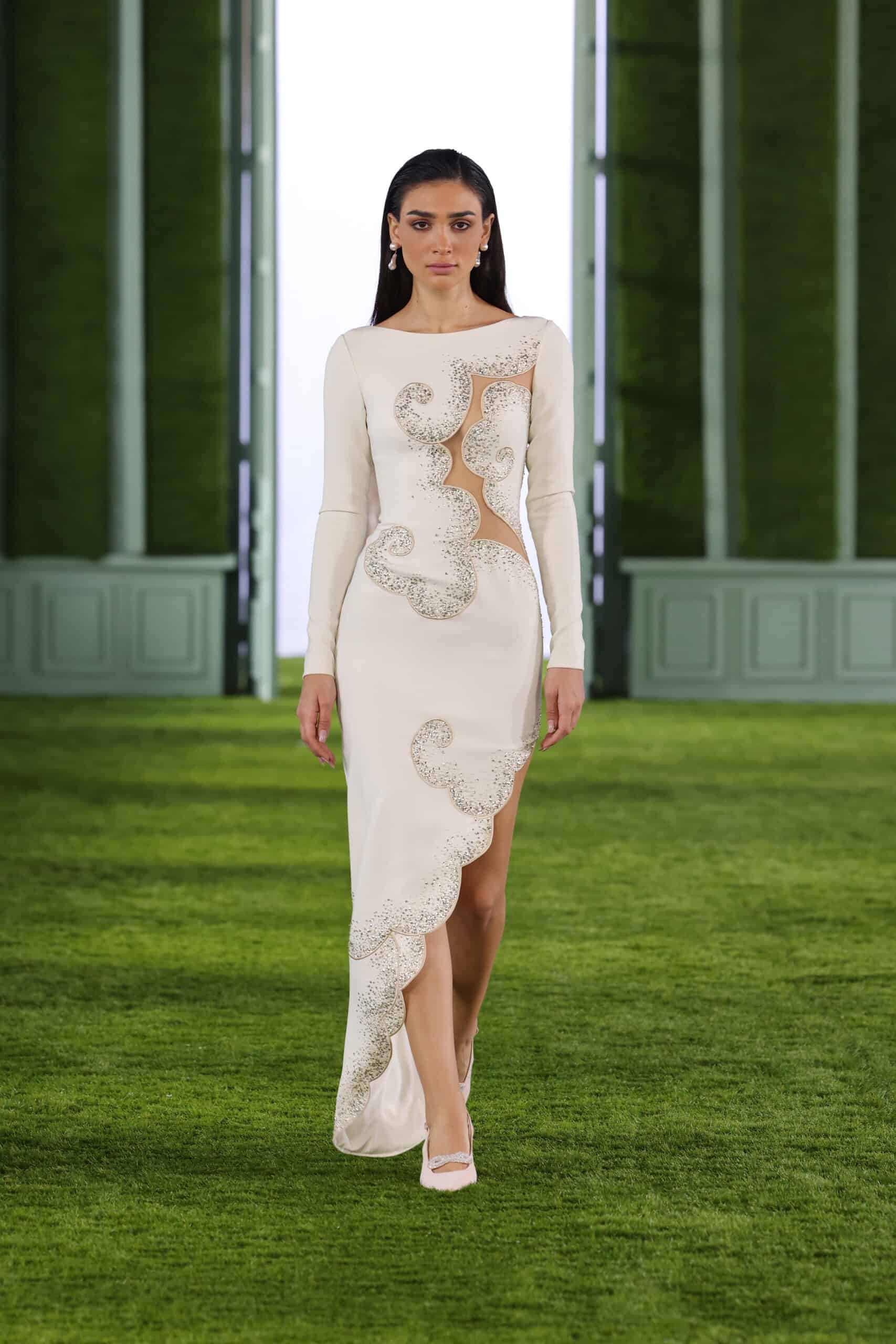 Embracing this spirited generation, Maison Georges Hobeika liberates its traditional codes—embroidery, embellishment, and tailoring—granting them newfound freedom in a space of understated elegance. The narrative unfolds with a dress borrowed from a maternal archive, infused with timeless chic but reimagined with a contemporary twist.