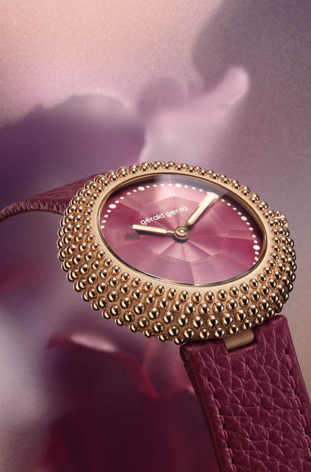 The Burgundy edition, inspired by the Tall Bearded Iris, shifts the mood: a 4N rose-gold case with a matte, velvety finish frames a brass dial hiding an octagonal guilloché; the deep burgundy tones echo the flower’s hues, with beads – designed to mimic dew – and strap to match for a quietly romantic glow.