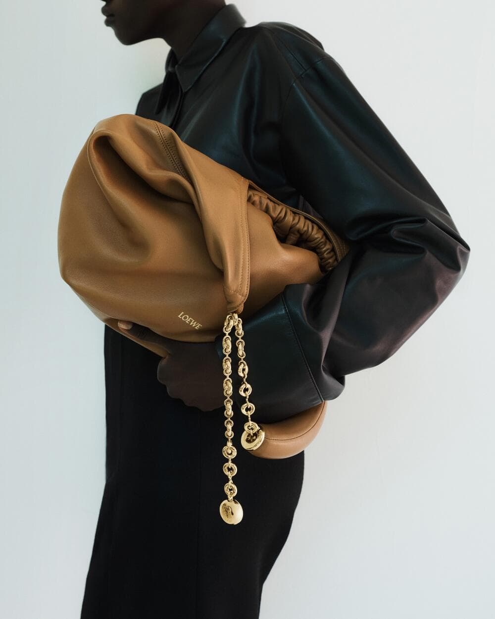 Starting from September 7, the Squeeze bag is available in small and medium sizes, offering a palette of shades including Chalk, Chocolate, Oak, Olive, classic black, and Seaside Blue. For those seeking the epitome of luxury, a limited-edition range in black python and crocodile skin will be available at select stores. Each Squeeze bag subtly features the LOEWE logo embossed in gold towards the base, along with a detachable, gold Anagram pebble adorning the chain’s end.
