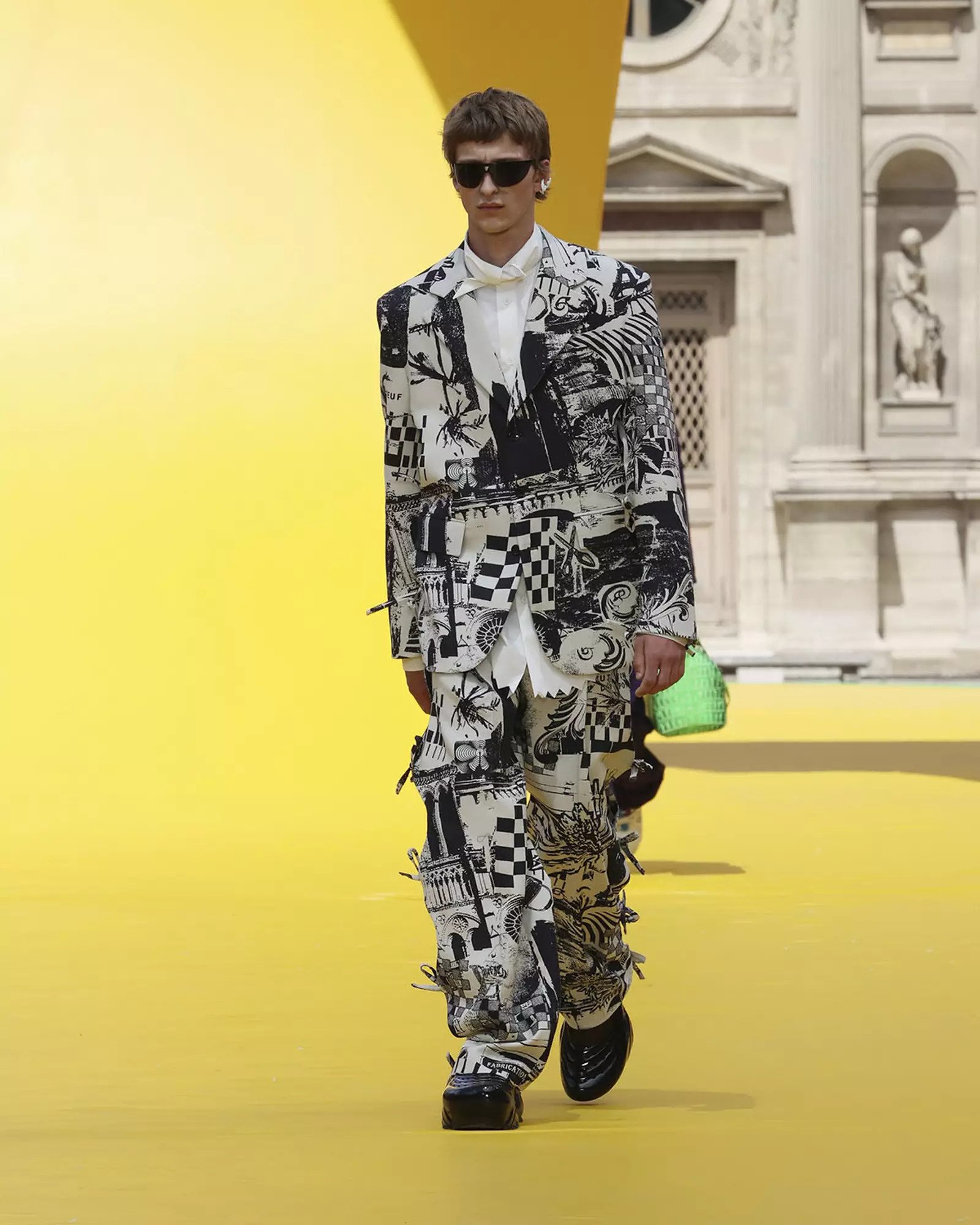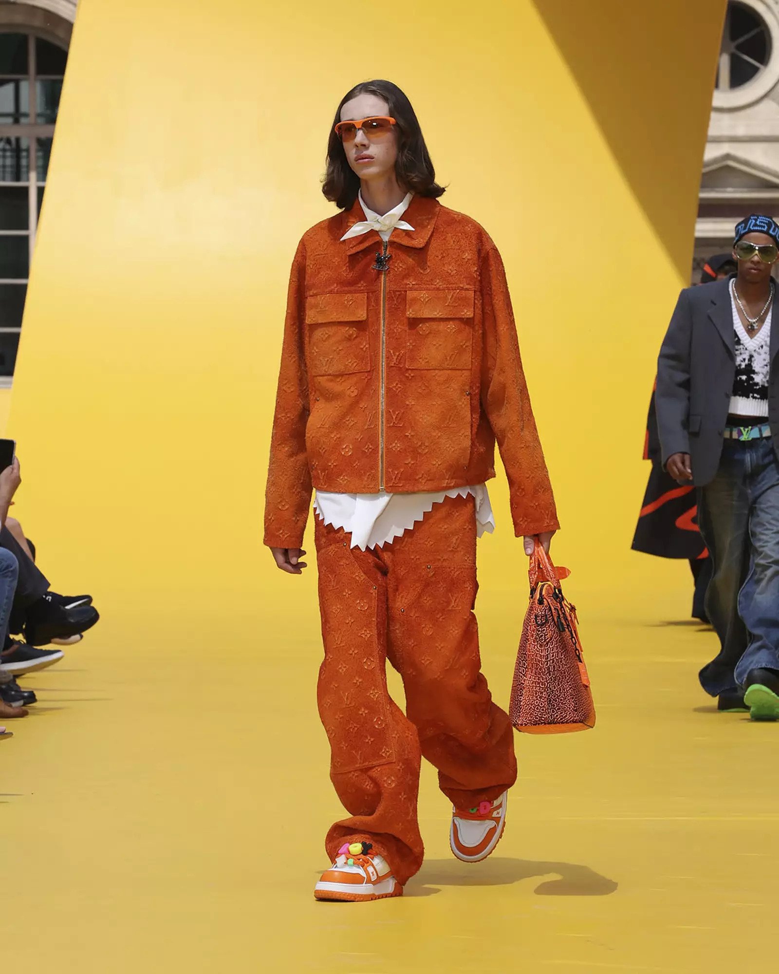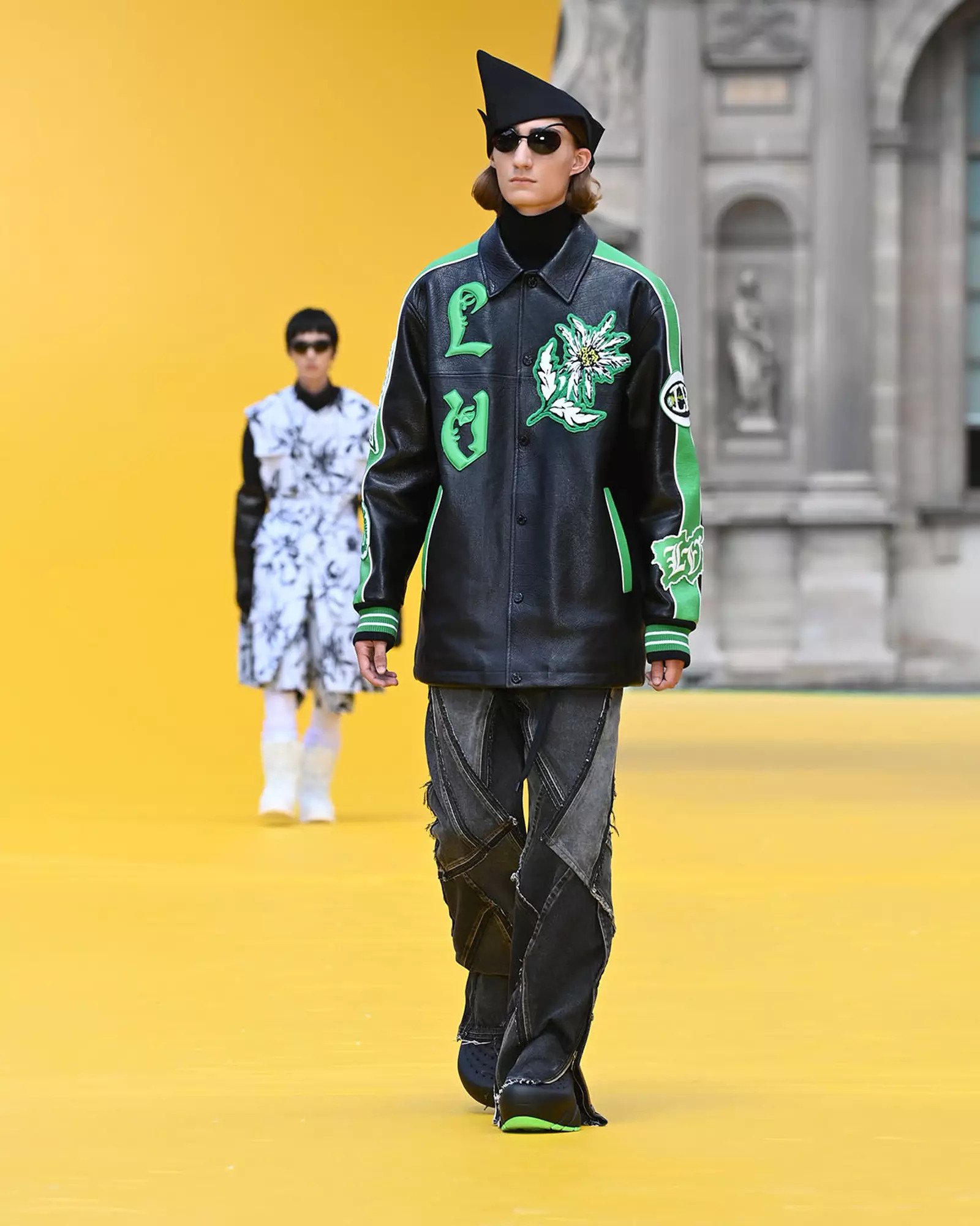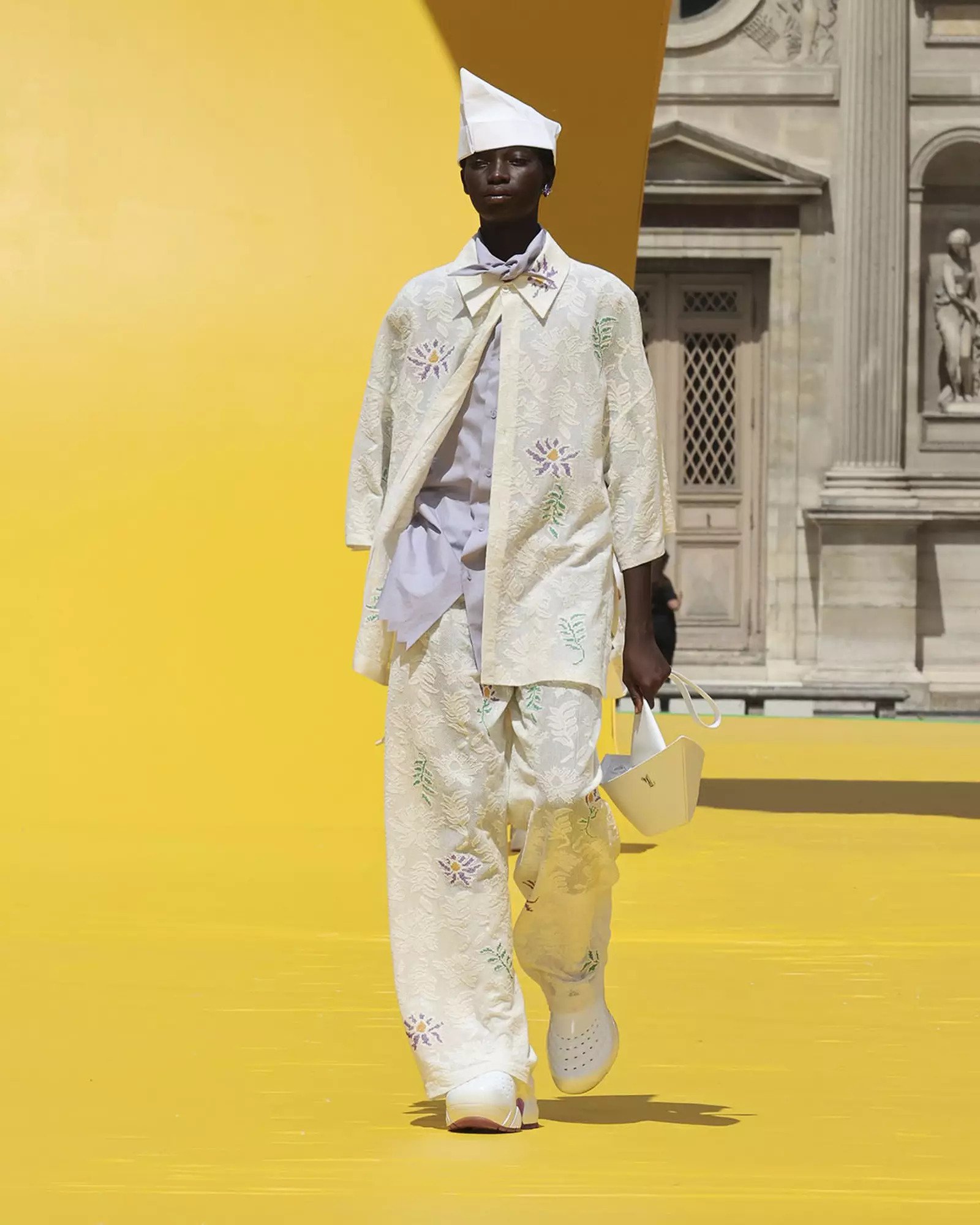 The show began with a prelude – a feature that Abloh introduced when he came to Vuitton – titled “Strange Math”. The prelude explored the relationship between reality and imagination, where the Florida A&M University, aka FAMU, performed an all-Black march pre-filmed in Paris’s alternate reality. A button push in a spaceship transported the band to the Cour Carree of the Louvre, where the show was hosted.