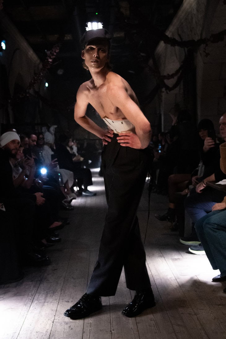 Subtle nods to the whimsical and fantastical world of gothic elegance and steampunk aesthetics weave through the collection. Galliano introduces groundbreaking techniques like seamlace and rétrécirage, pushing the boundaries of haute couture with seamless lace garments and strategically shrunken tweed, forming anatomical and coquettish shapes. Stripe-tease, gouttoir-coating, and Rorschach dotting add layers of intrigue to pattern creation in doll-like accents. The models, with their meticulously crafted porcelain faces by Path MacGrath blur the boundary between reality and artistry, enhancing the surreal atmosphere of the collection.