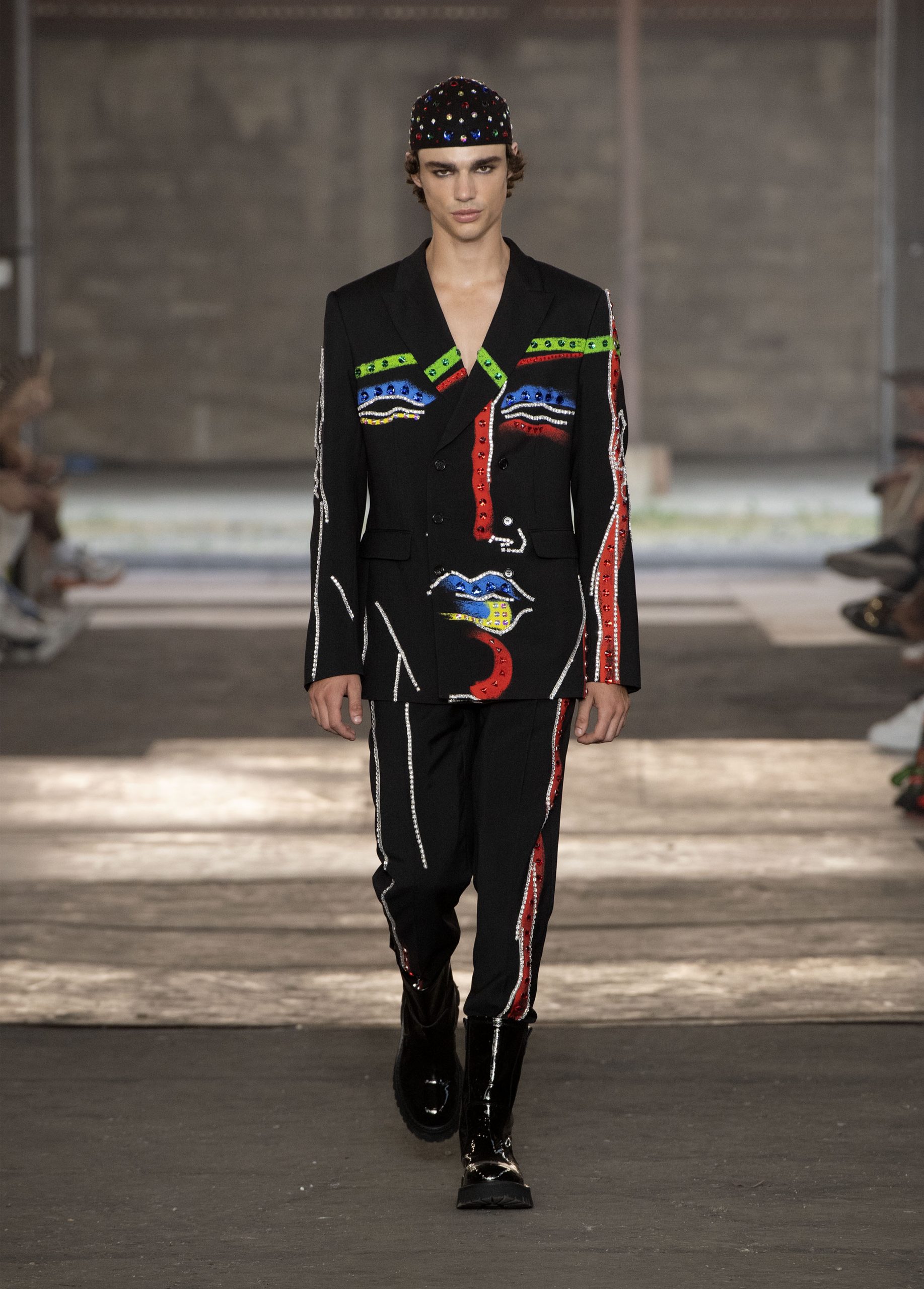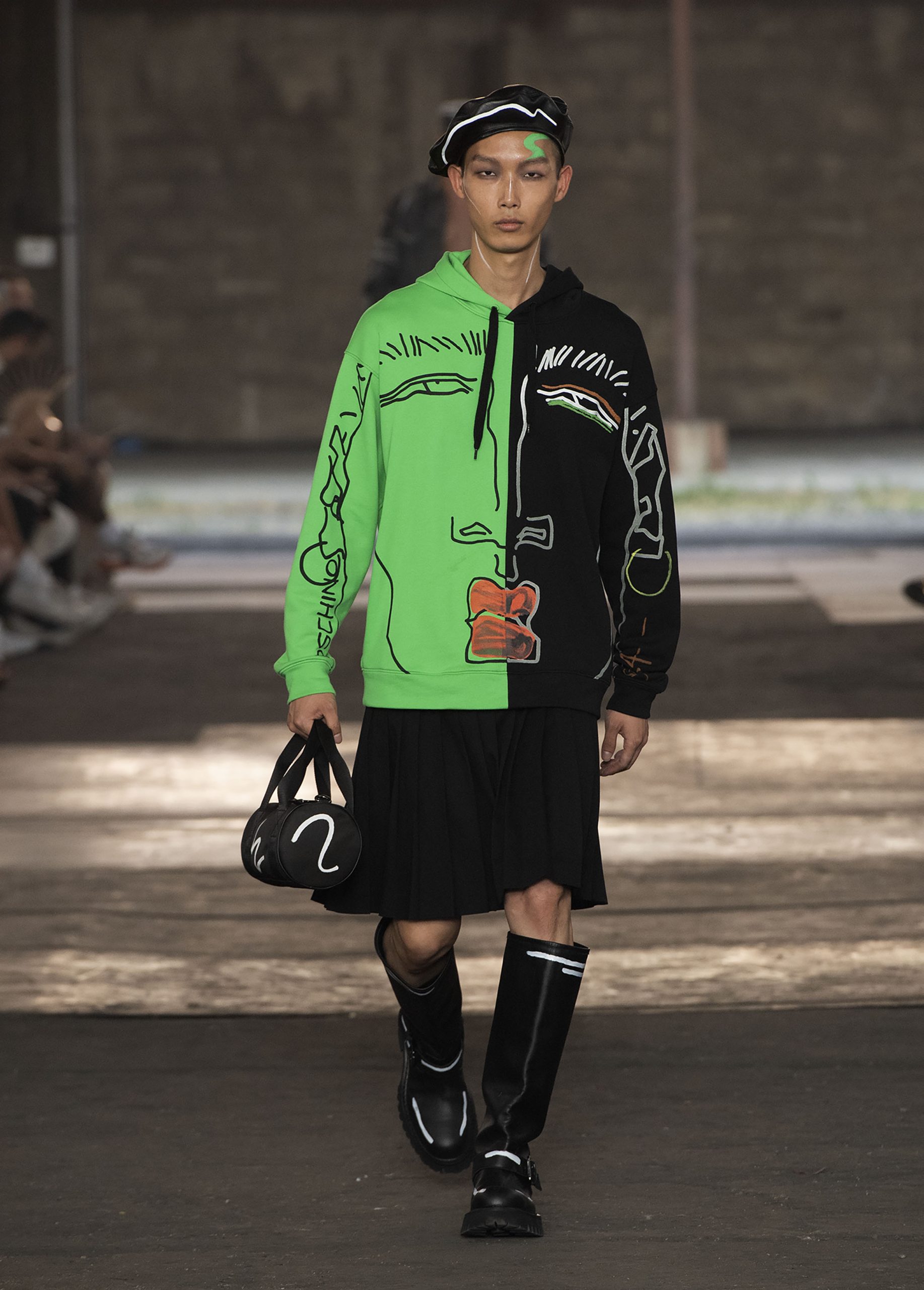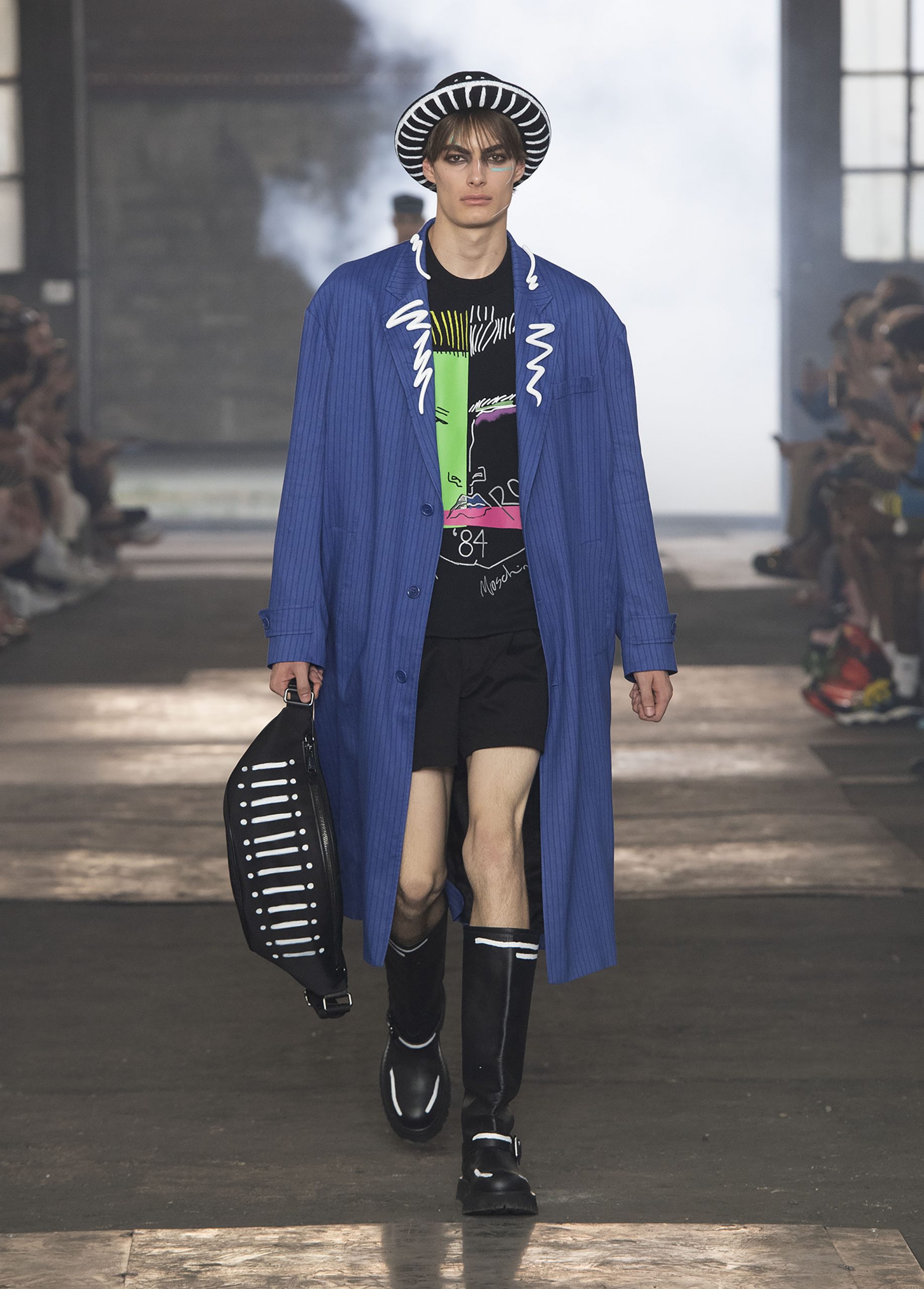 The collection comprises pieces that include abstract visages, bright and attenuated colours, expressive strokes that cover Moschino’s signature shapes, and new silhouettes. Long and short shorts, pleated skirts and sarongs, tapered pants, and roomier trousers all feature in a collection that places tailoring at centre stage in the form of blazers, suits, and topcoats have been given the polychrome treatment.
