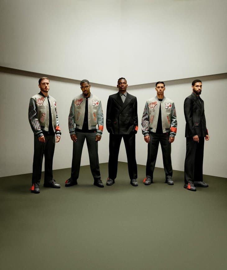 The summer uniform features a field jacket adorned with artful patch pockets on the chest. Statement tags, proudly displaying the player’s uniform number, add a personal touch to the ensemble. What was once a pocket square is now an Off-White logo, subtly asserting the brand’s presence. Paired with suit-style pants boasting a relaxed fit, this look embodies both form and function.