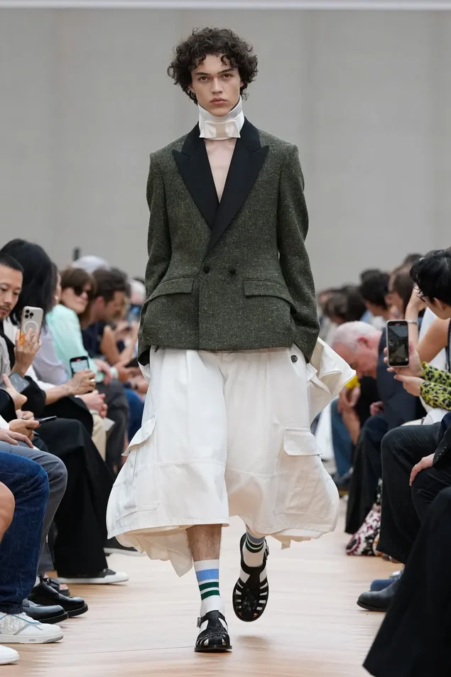 Kim Jones who? Jonathan Anderson’s debut for Dior Homme was a shift. In a fashion landscape often obsessed with novelty but allergic to risk, Anderson did what few dare: he rewrote the Dior playbook without disrespecting it. From cryptic Close Friends invites to ceramic tokens replacing traditional show cards, the build-up felt more like an underground art happening than a global brand activation. And then came the clothes – Bar Jackets reimagined with volume and wit, cargo-pleated shorts that shouldn’t work (but gloriously do), and tailoring that winked at tradition while dismembering it. It was a cerebral, sculptural, and utterly strange collection, grounded in British eccentricity and French heritage – proof that Anderson isn’t just stepping into Dior, he’s reshaping it from the inside out.
