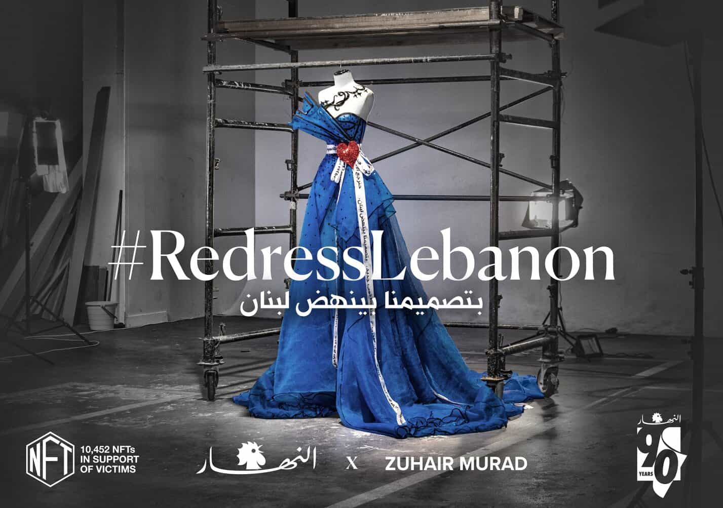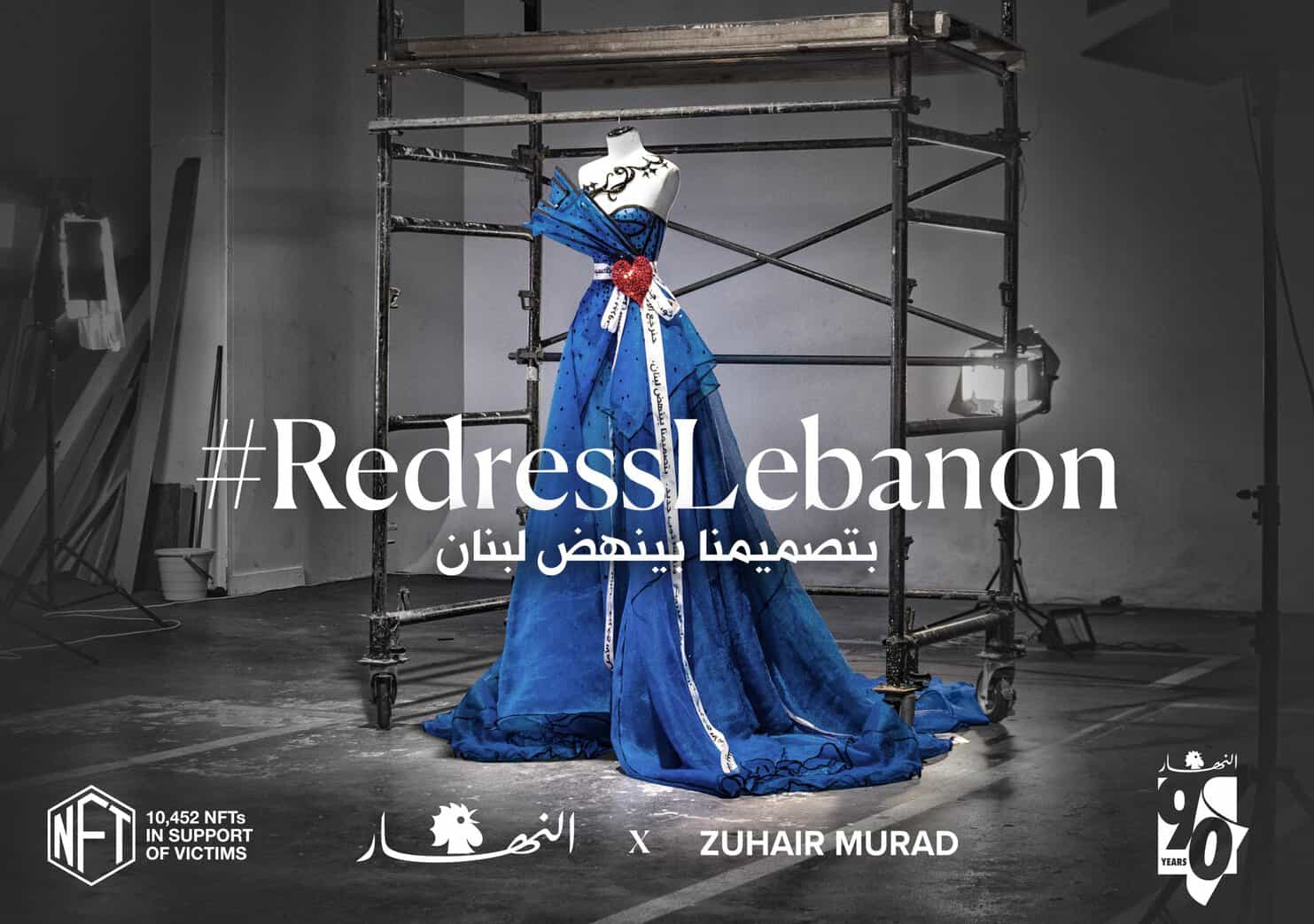 On the second anniversary of the devastating Beirut blast, Lebanese designer Zuhair Murad launched the #RedressLebanon campaign in collaboration with IMPACT BBDO and AnNahar newspaper. The initiative will auction 10,425 NFTs of the dress to raise funds for those affected by the explosion. The proceeds from the auction will go to the Idraac NGO, which is dedicated to mental health. The designer used the mesh fabric covering the site of the explosion to create a gown.