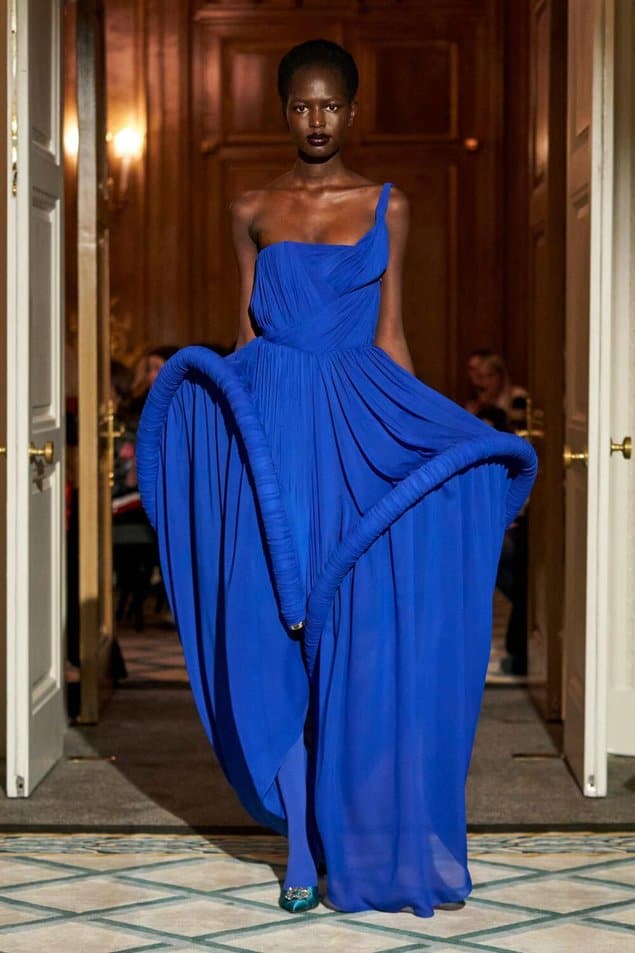 From the art deco haven of Claridges, Roksanda Ilincic’s (Instagram) eponymous Autumn Winter 2023 ensemble unravels as an intimate ode to art, design, and camaraderie. Embracing the continuum of intimacy and heightened sentiments, this collection from ROKSANDA paints a vivid canvas reflecting the valor of charting one’s unique trajectory and the audacity to actualize it. From these paradoxes, an intricate web of connections is woven, fostering an introspective dialogue with oneself and the extended community. Echoing this sentiment, the verses of visionary artist and wordsmith Arch Hades’ Arcadia gracefully intertwine with the designs.