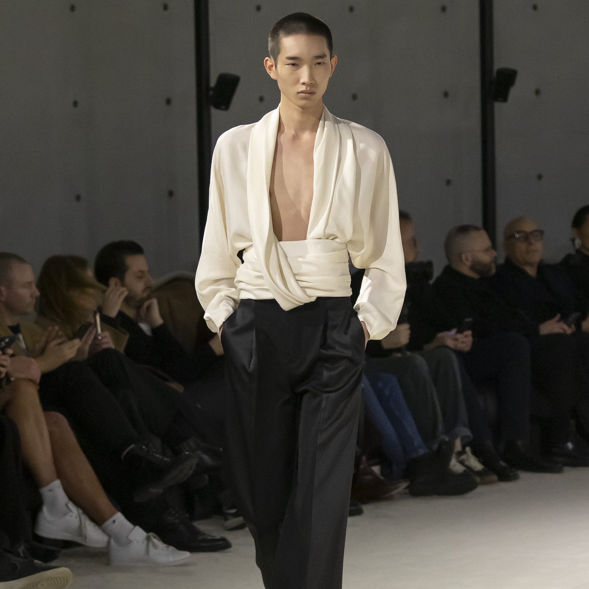 As with his womenswear collection, Vaccarello brought the capuche, or hood, to wrapped and draped tops, as he did with dresses at Saint Laurent Women. Hooded knitwear tunics were paired with ground-skimming, sweatpant-inspired trousers that bring a sense of ease to the otherwise precise design.