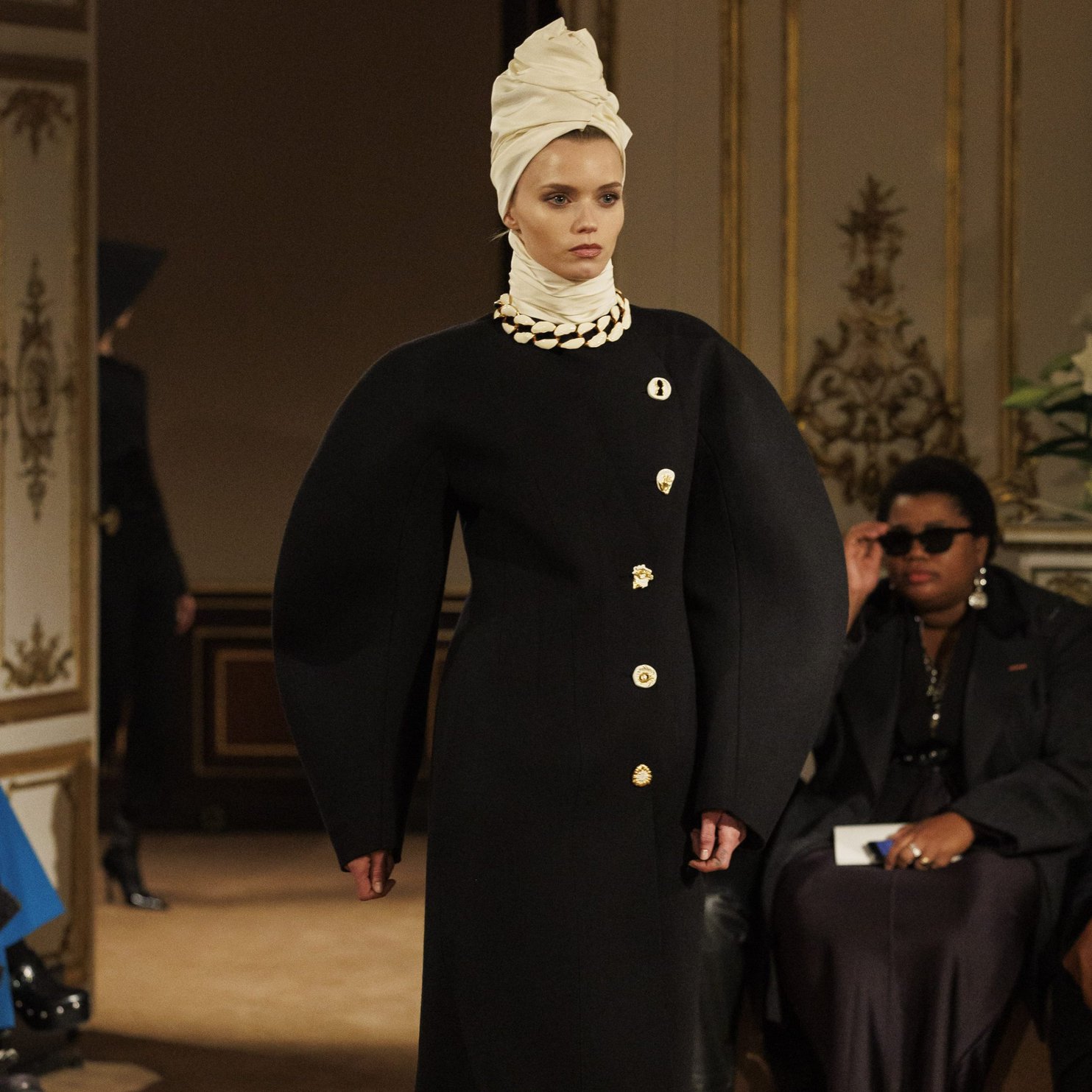 Key looks from the collection include a shawl-collar coat that is buttoned up in black, compact wool with dove-inspired, exaggeratedly rounded sleeves, decorated with enamel and gold-toned brass buttons. An oversized parka is crafted from technical satin padded with feathers and adorned with golden hammered brass buttons. The parka is worn open, atop a quilted cardigan jacket trimmed with a strip of leather. The balaclava is crafted from black cashmere and decorated with golden brass rivets.