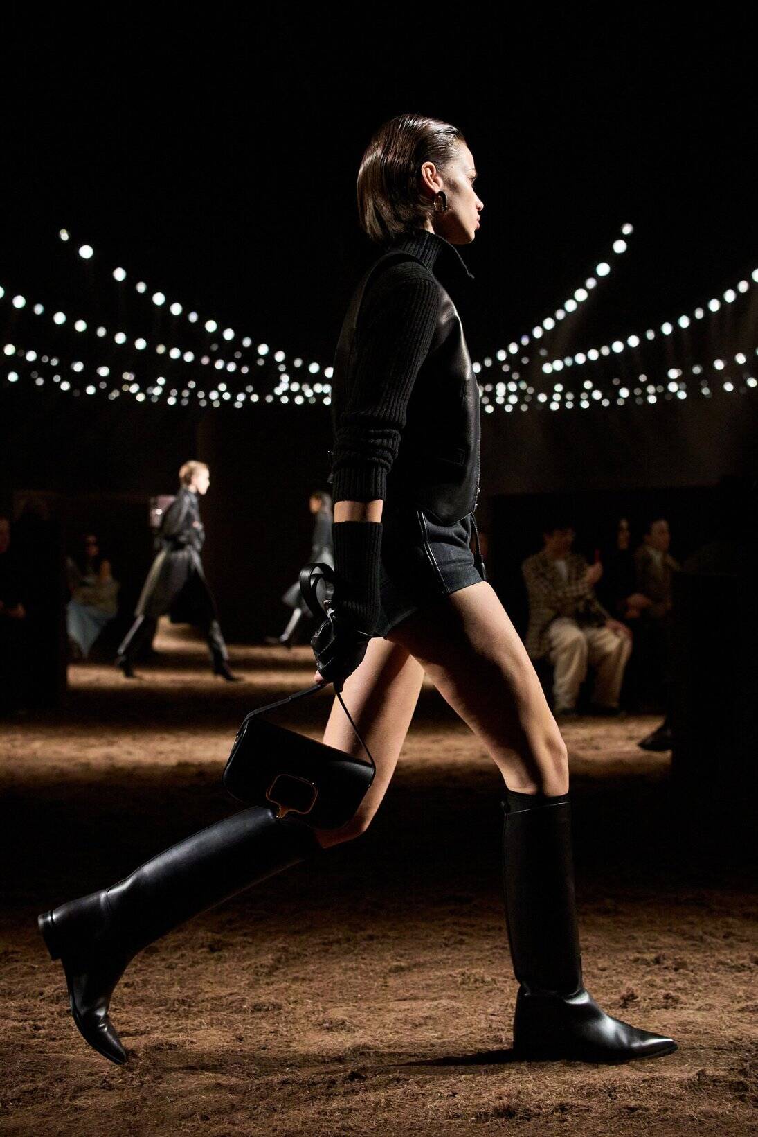 Footwear remained resolutely on theme: flat winklepicker boots and high-heeled brogues that looked fit for both the stable and a saloon. And then the bags—those objects of Hermès lore—appeared in scaled-down, almost private dimensions. A saddlebag in plum leather with an exaggerated silver horse-bit detail was perhaps the most succinct metaphor for the collection’s mood: controlled flamboyance.