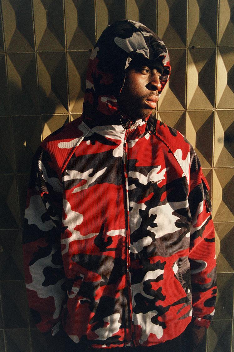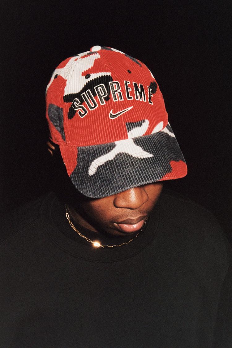 One of the standout items from the collection is a red Bape-y camouflage print Arc Corduroy Hooded Jacket that features contrasting black details with the iconic Swoosh logo on the right side of the front, the middle of the hood, and the back of the jacket.