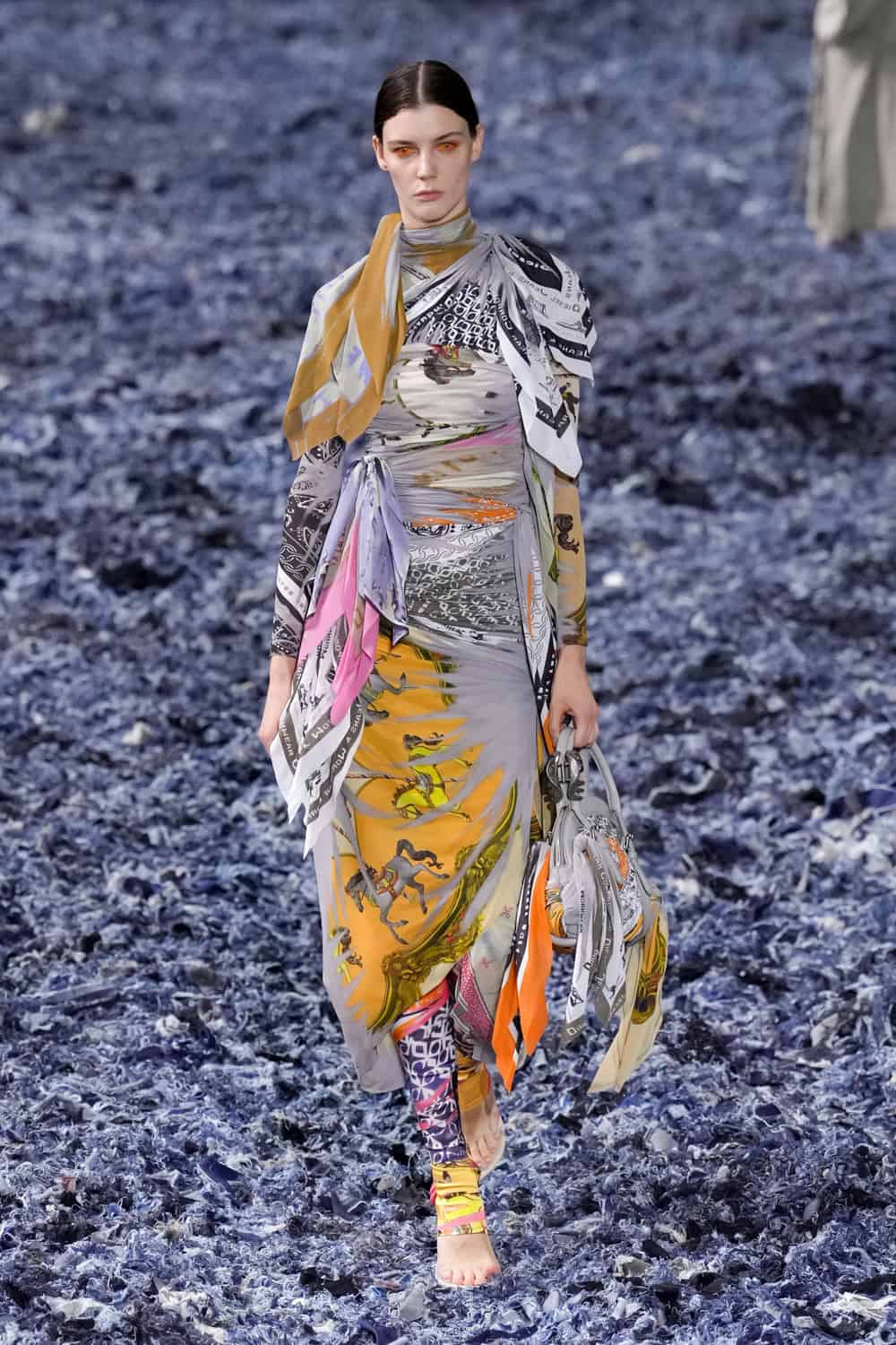The focus on circular design brings Diesel’s archival bandana prints back to life, reimagined in a collection of draped and knotted dresses and tops. These prints are applied to pleated fabric, which is then cracked to reveal a striking trompe l’oeil effect, giving the garments a wrapped and draped appearance. Additionally, an artisanal jacket and coat are crafted from waste yarn, wrapped and tied to form organic, flowing shapes, almost as if the floral patterns themselves are alive.