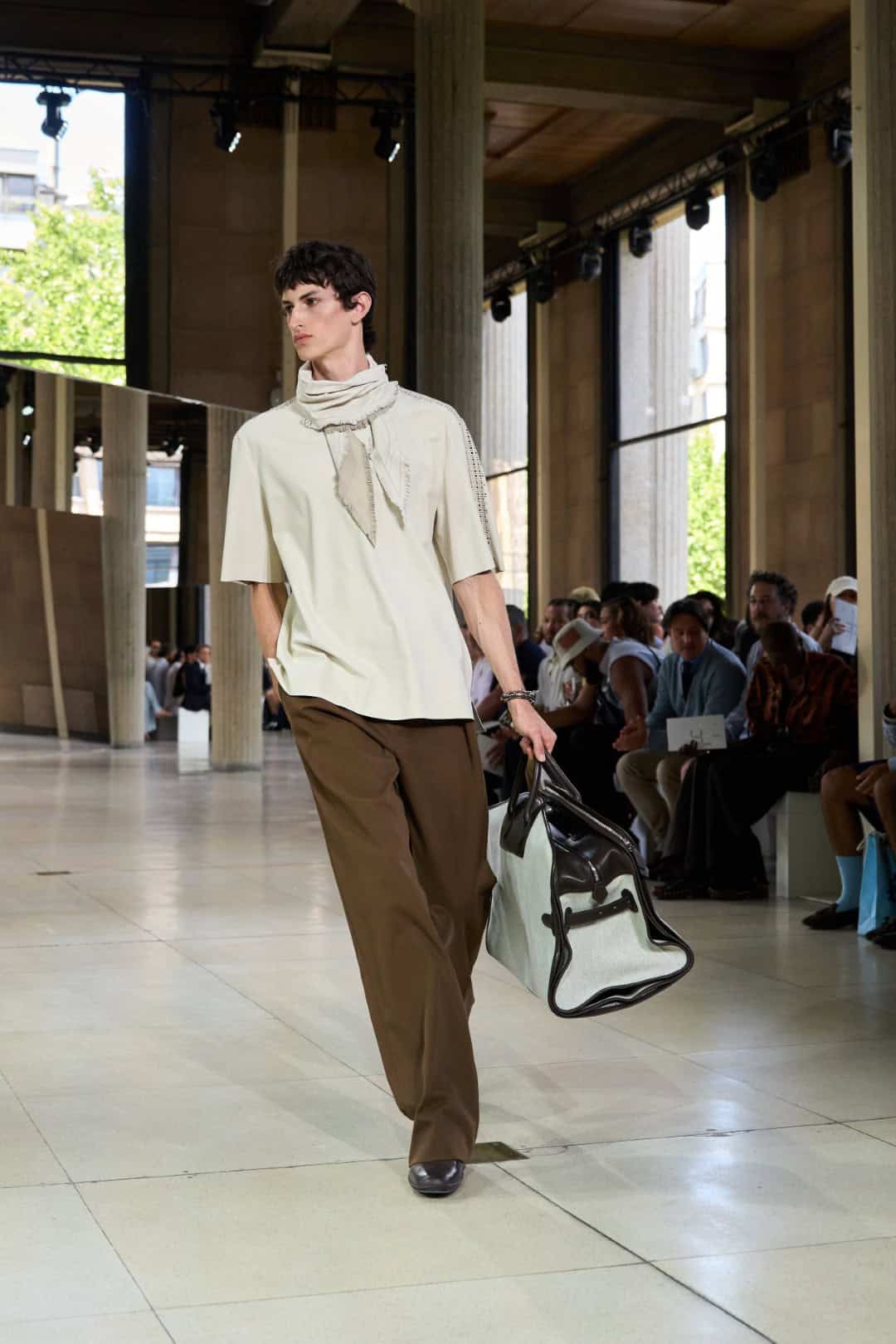 And leather? Not just for bags this time. It shed its stiffness and was reimagined as airy knit shirts and soft breezy trousers. Unexpected for a summer collection, perhaps, but it made sense here. Paired with models gliding down the runway in loosely tied silk scarves, it all clicked. This was luxury tailored to live in, not pose.