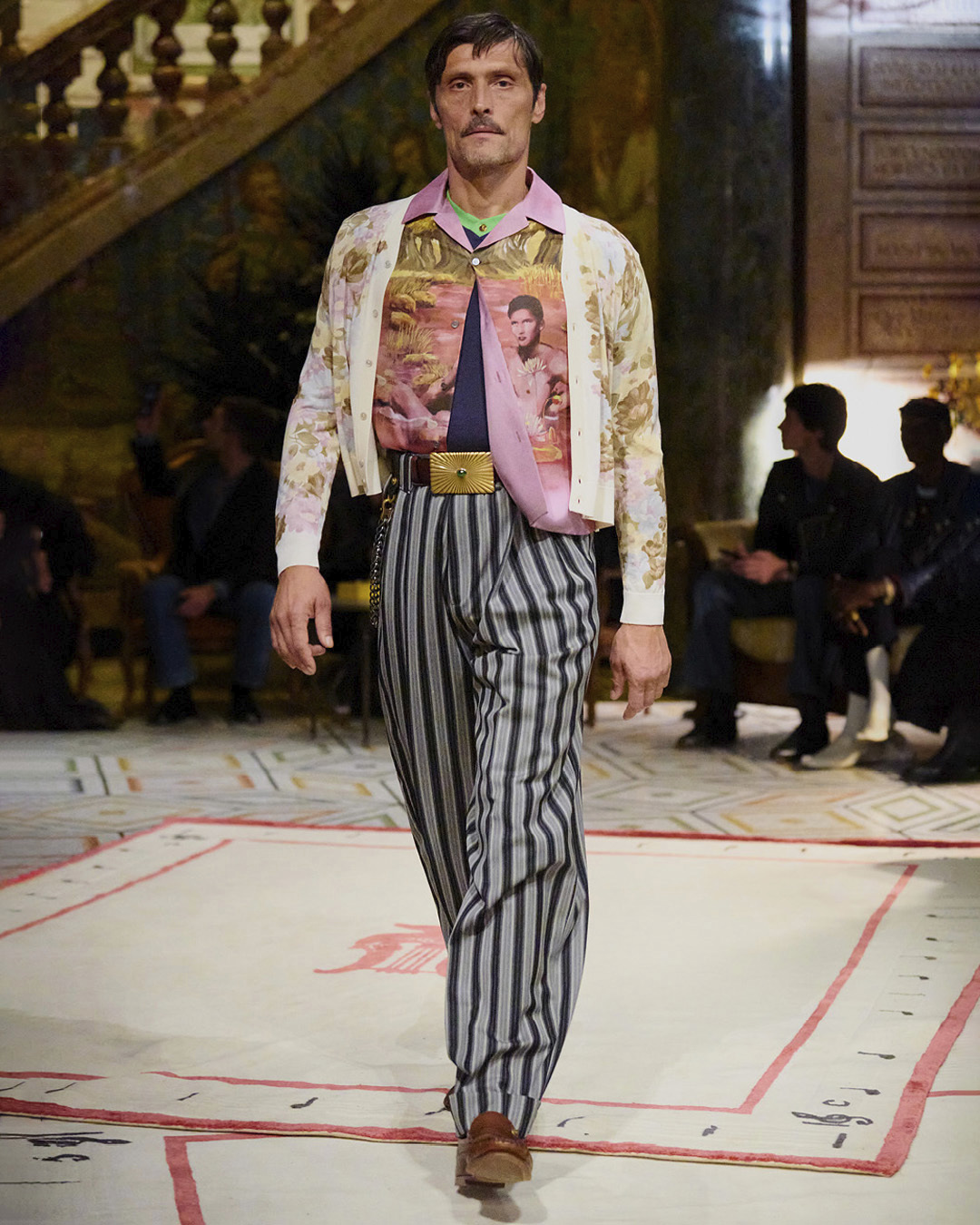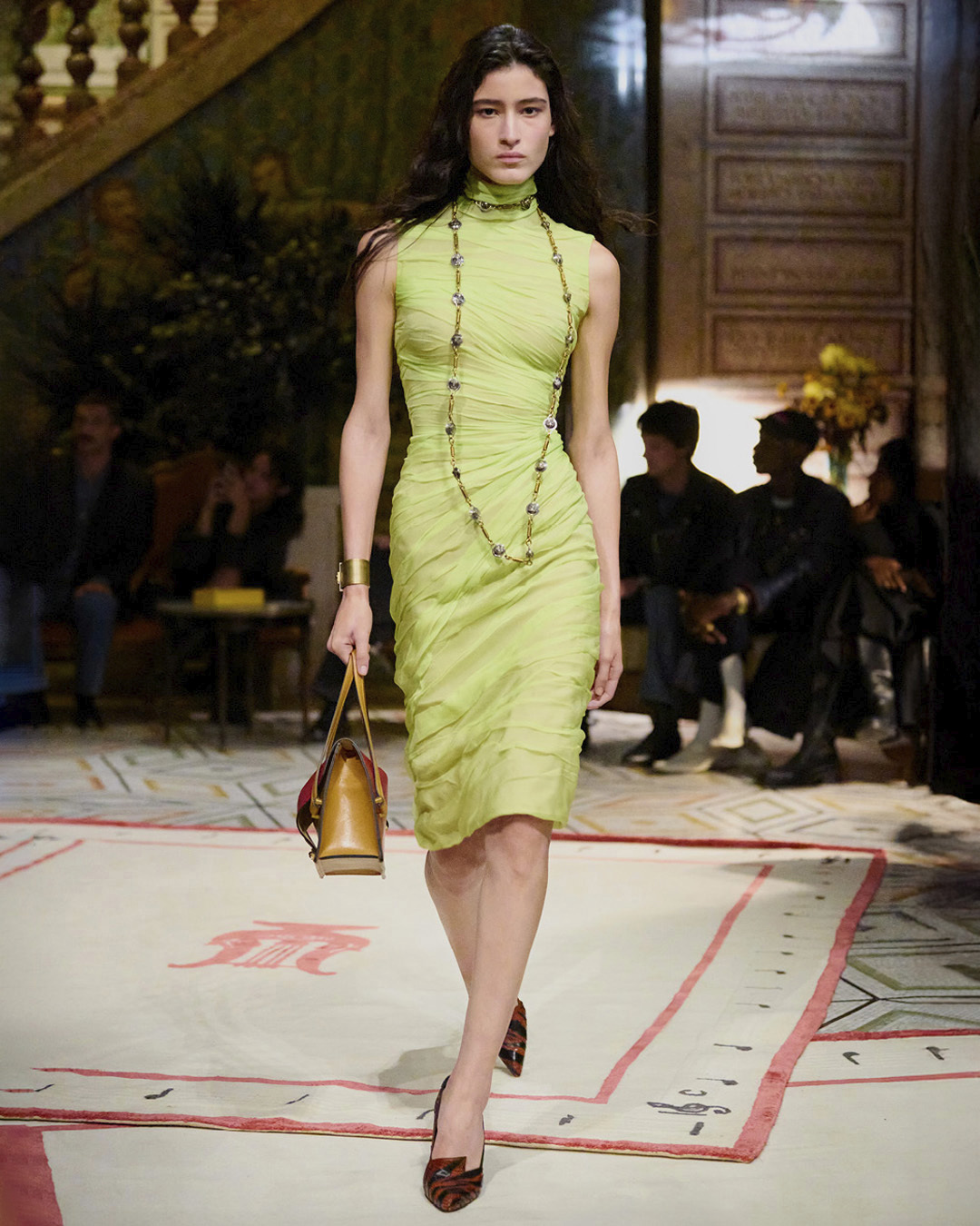 Inside the 17th-century palazzo, Vitale introduced himself with a full-throttle embrace of Versace’s most primal codes: sexuality, mythology, and Italian audacity with a Miami vibe – snug denim, open-sided T-shirts, and dresses that seemed on the verge of falling away in bursts of colour. But it wasn’t just skin. We were given Miami heat: 80s pastel tailoring, high-waisted pleated pants, exaggerated shoulders and leather fanny packs straight off South Beach. There were echoes of Miami Vice, but filtered through 1991 Versace Jeans couture campaigns and the pastel-leather mashups of 1992.