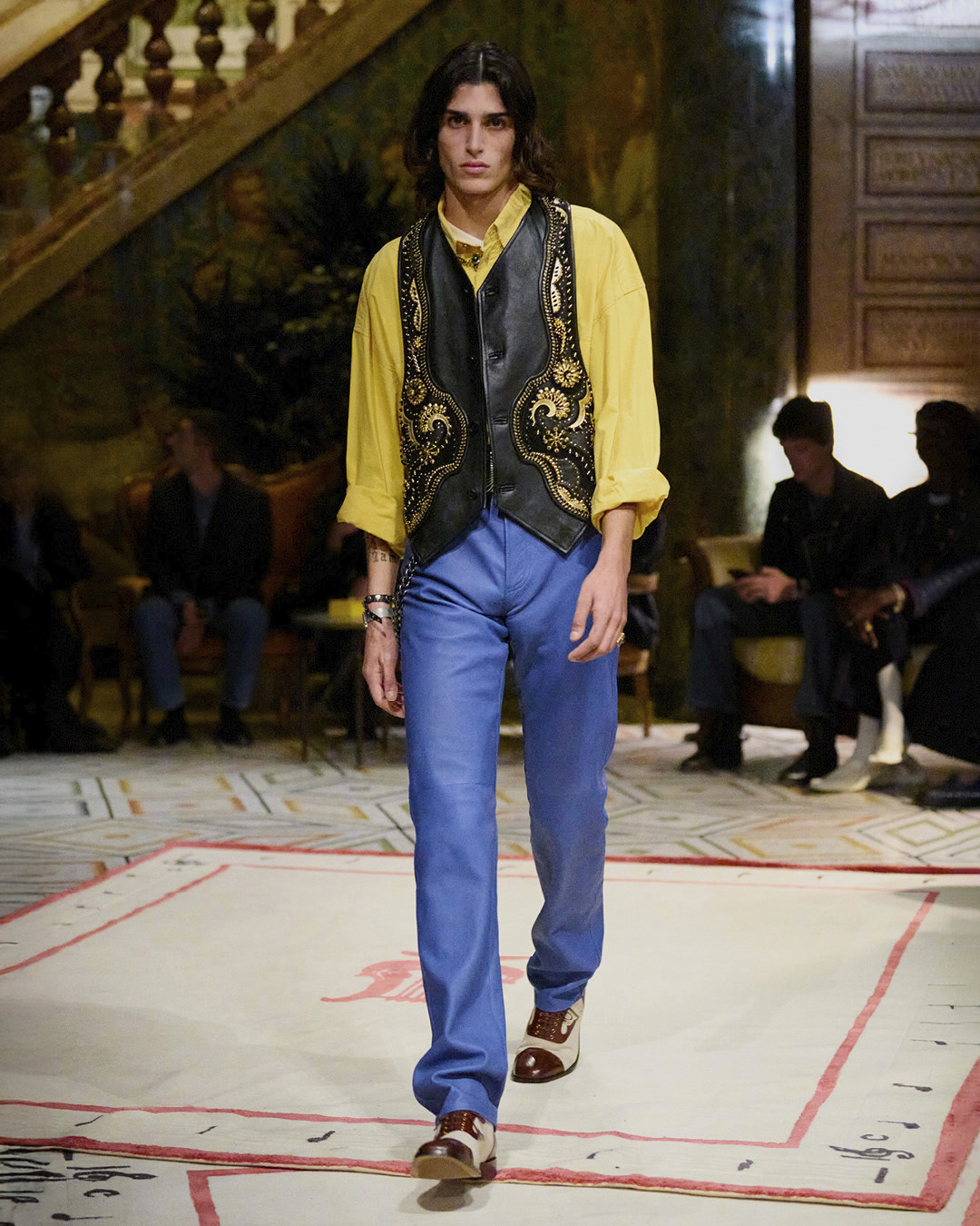 Vitale balanced desirability and wearability: yes, the spectacle was pure Versace, but there were pieces you could pull apart – leather trousers paired with suiting jackets, beaded western vests on pastel denim – that will walk straight off the runway and into wardrobes. Even the shoes hit differently: the return of the Court Pump, its shorter, thicker heel adding an edge of power dressing. Styled with a beaded dress, the effect was both 80s glamour and very Princess Diana.