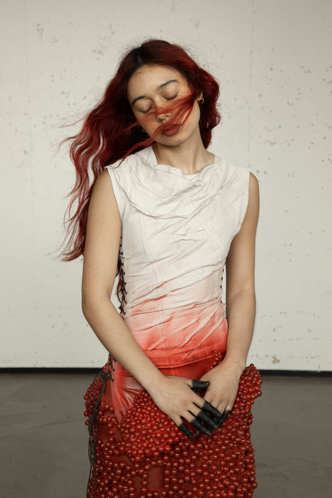 Designing the textile is my favourite part of making garments! I constantly push myself to experiment with new materials, approaching each choice meticulously, as it defines the very essence of the piece. Some of my previous projects include using wooden beads to reflect heaviness, repurposing a wedding dress into a bridal jersey, and even experimenting with grass, chandelier crystals, and 3D printing.